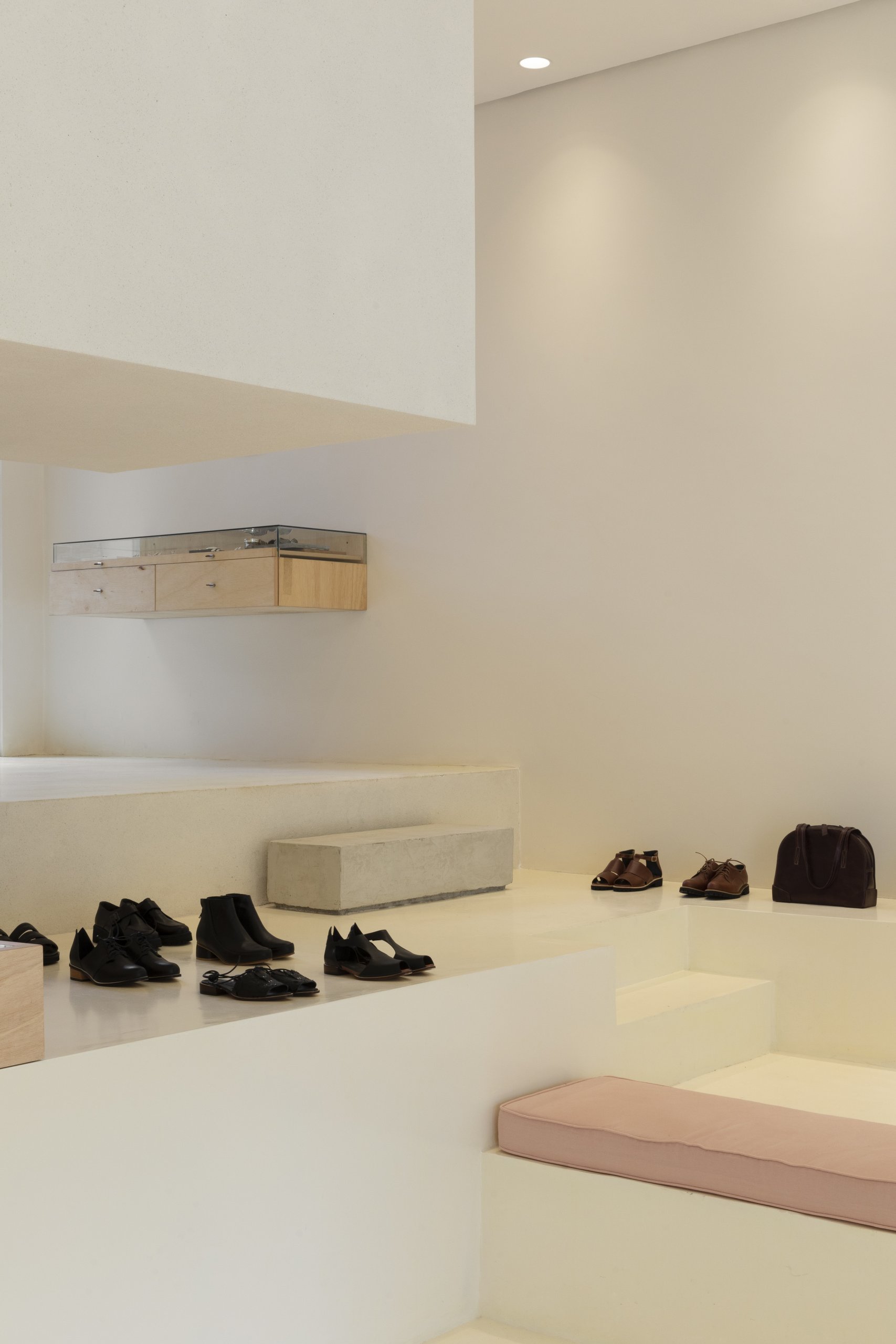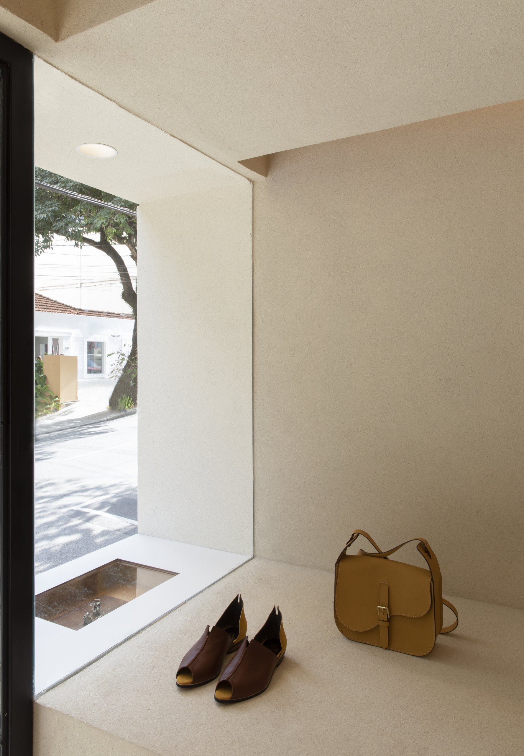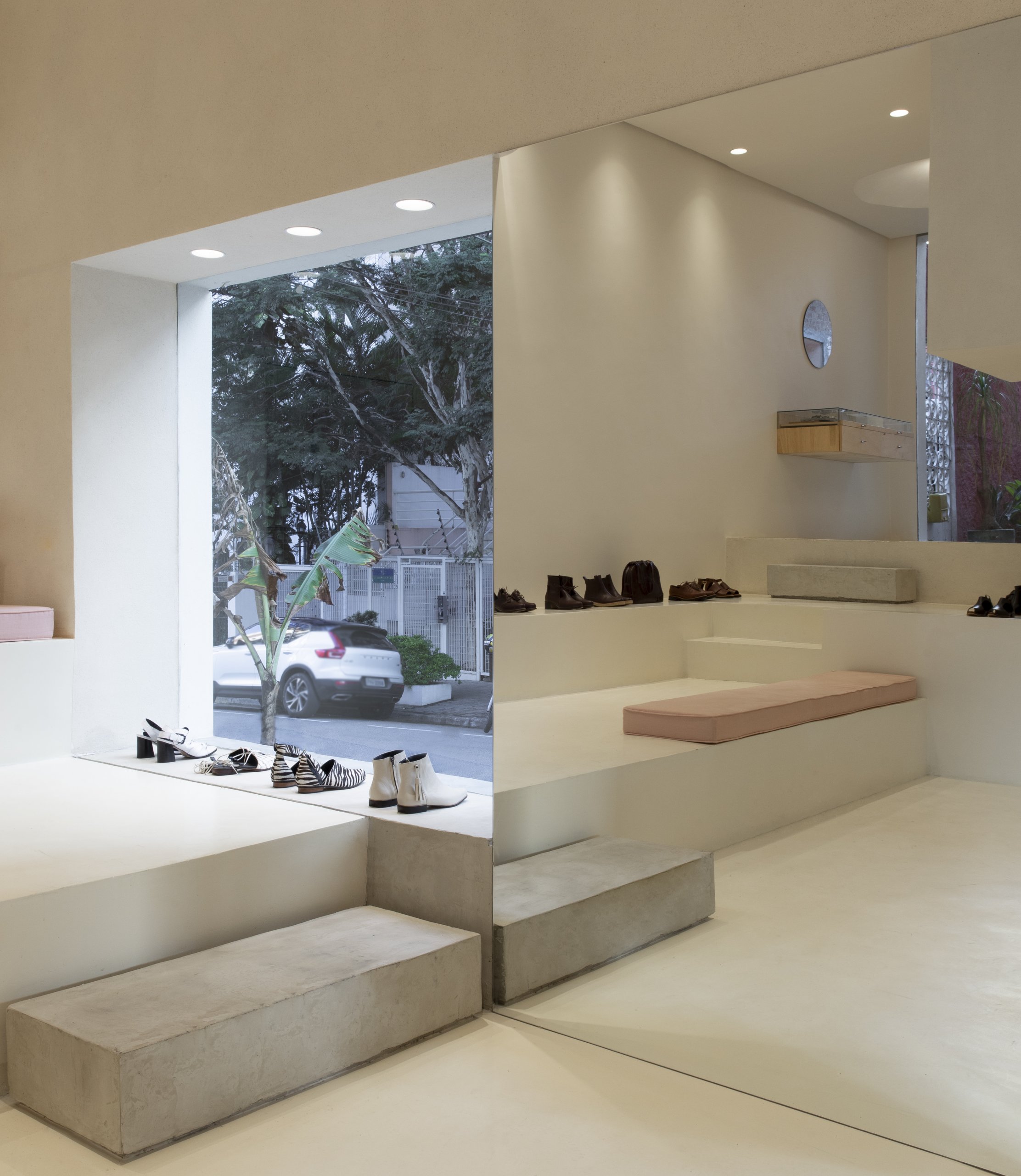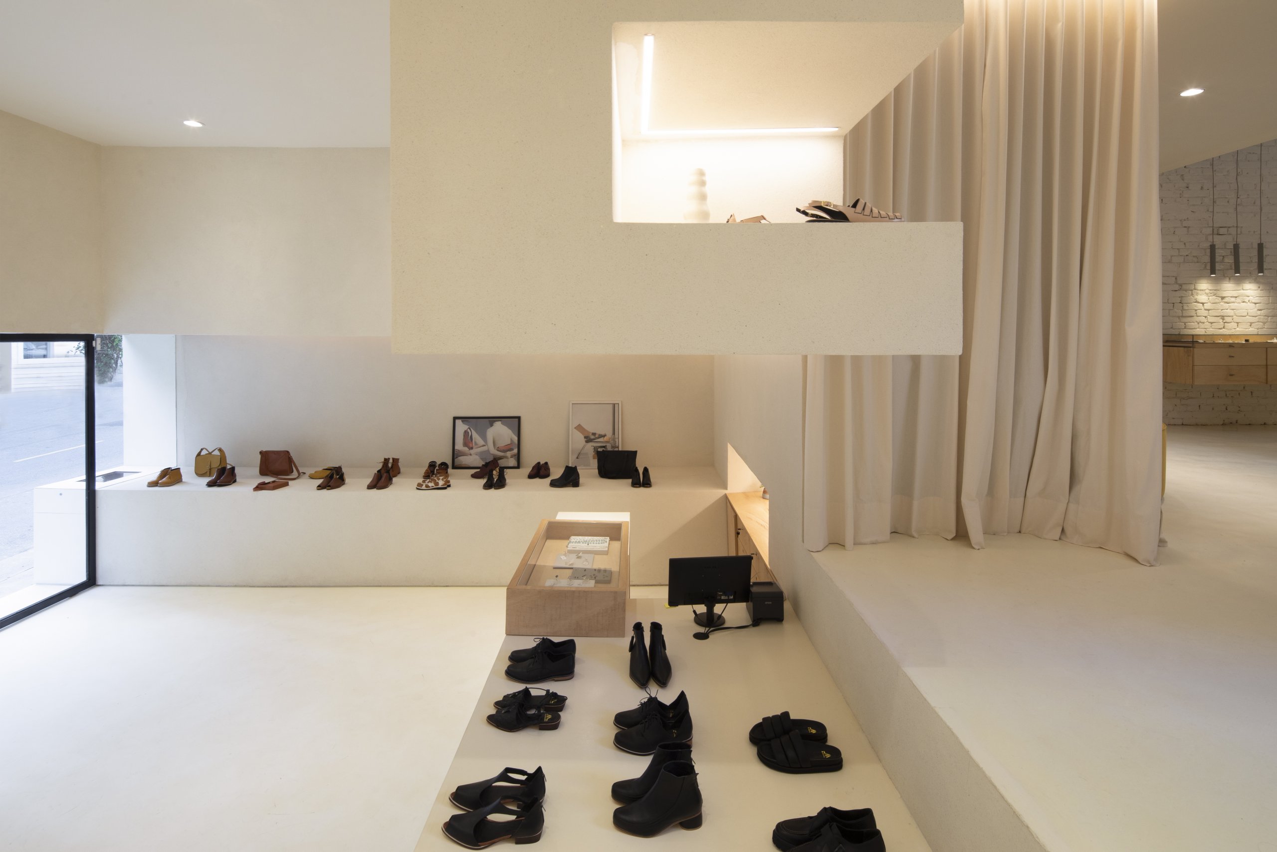 A arquitetura como expositor, guia a espacialidade da loja. Unindo o existe com a intervenção proposta, o espaço se forma pelo seu percurso. Este é guiado pelos distintos níveis em que estão expostos os sapatos. O caminho delimitado integra os dois ambientes, utilizando de elementos como cortinas e domos para formalizar esta integração espacial de maneira a se criar uma unidade para a loja.
