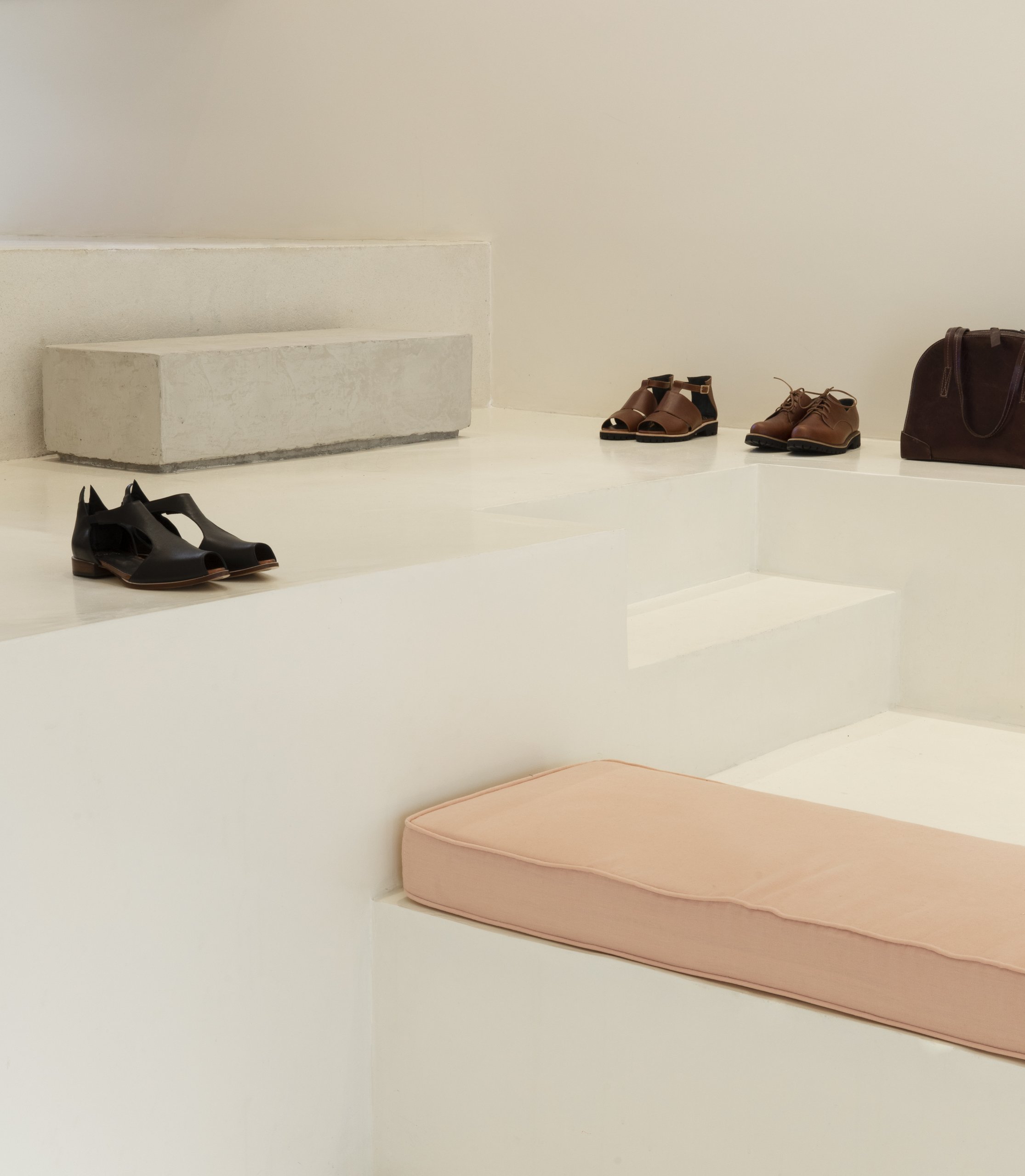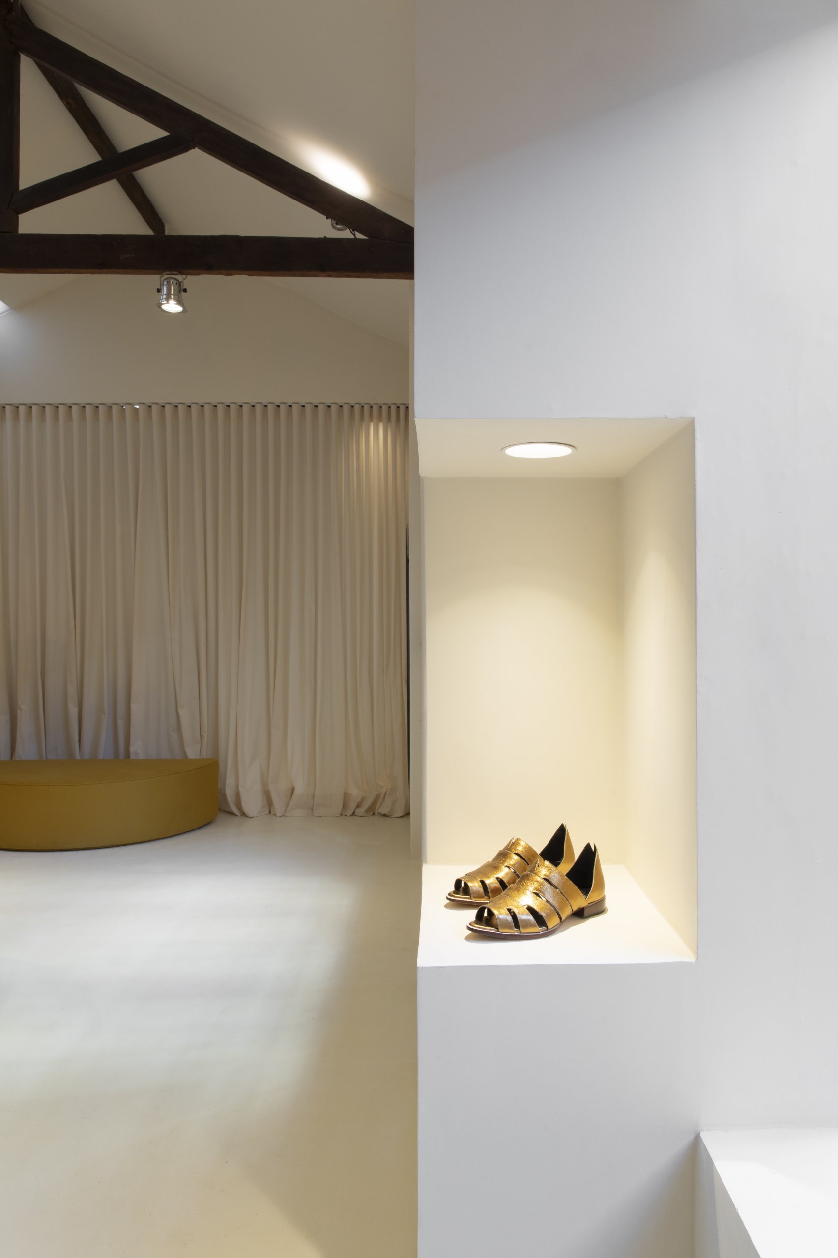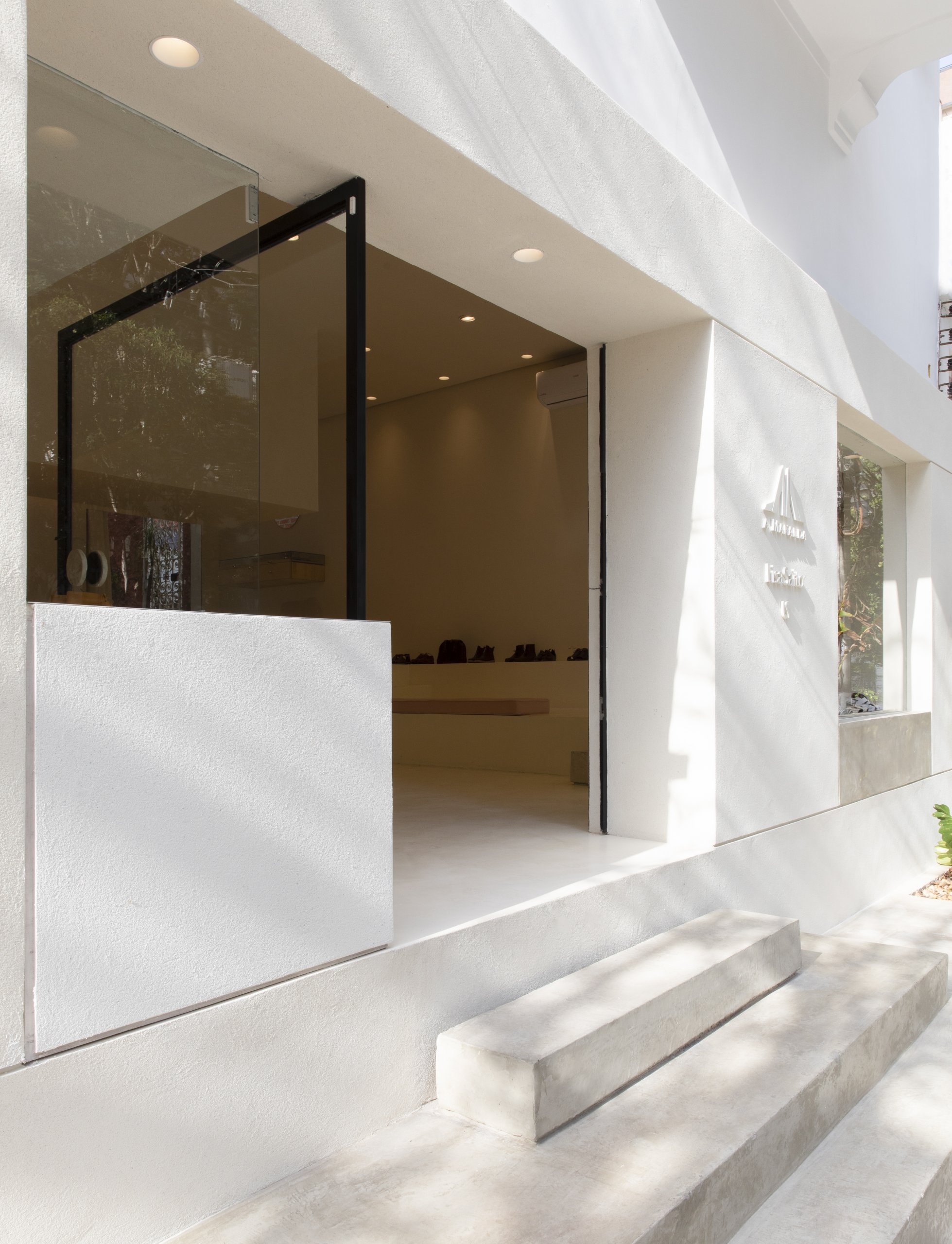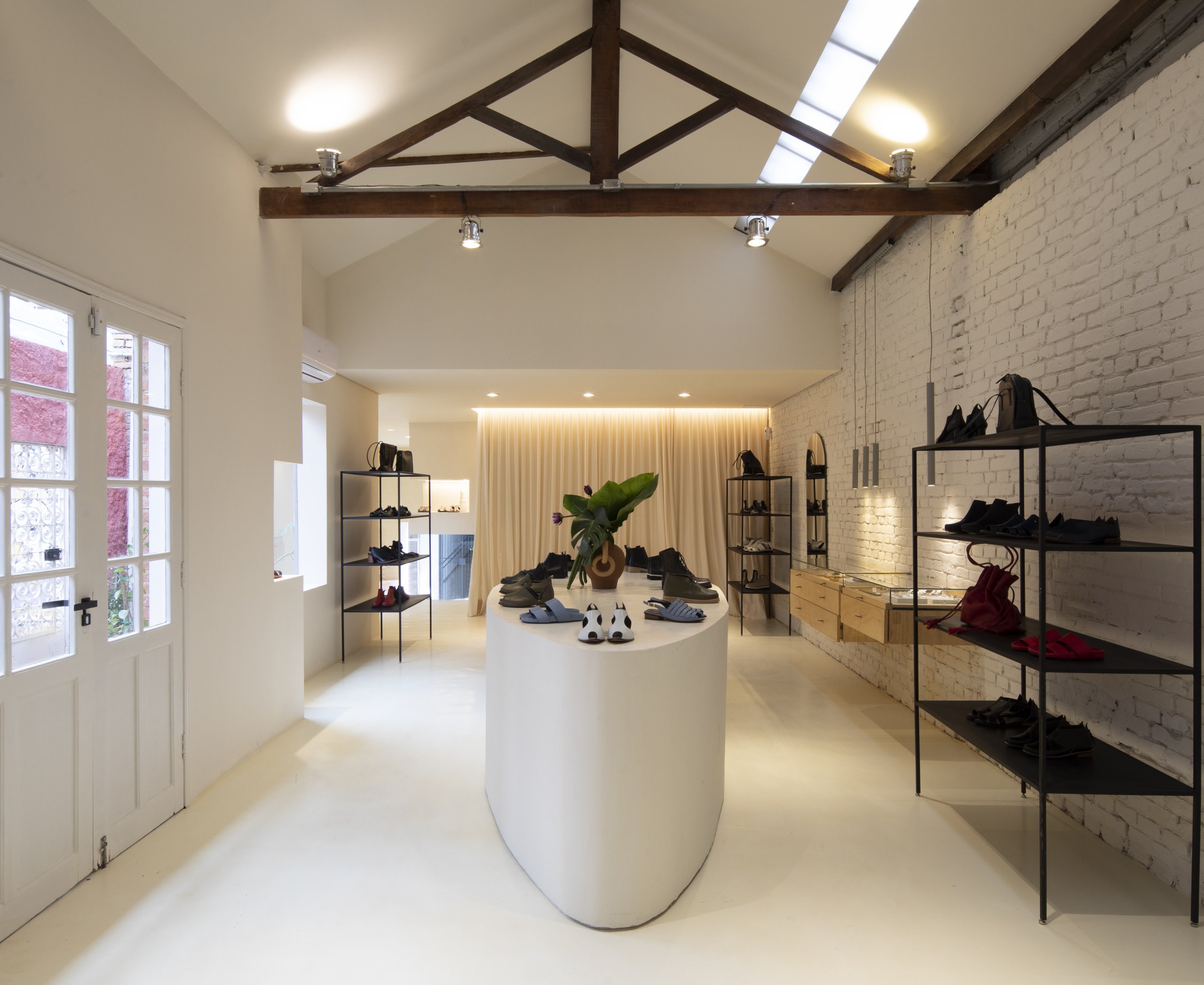 A arquitetura como expositor, guia a espacialidade da loja. Unindo o existe com a intervenção proposta, o espaço se forma pelo seu percurso. Este é guiado pelos distintos níveis em que estão expostos os sapatos. O caminho delimitado integra os dois ambientes, utilizando de elementos como cortinas e domos para formalizar esta integração espacial de maneira a se criar uma unidade para a loja.