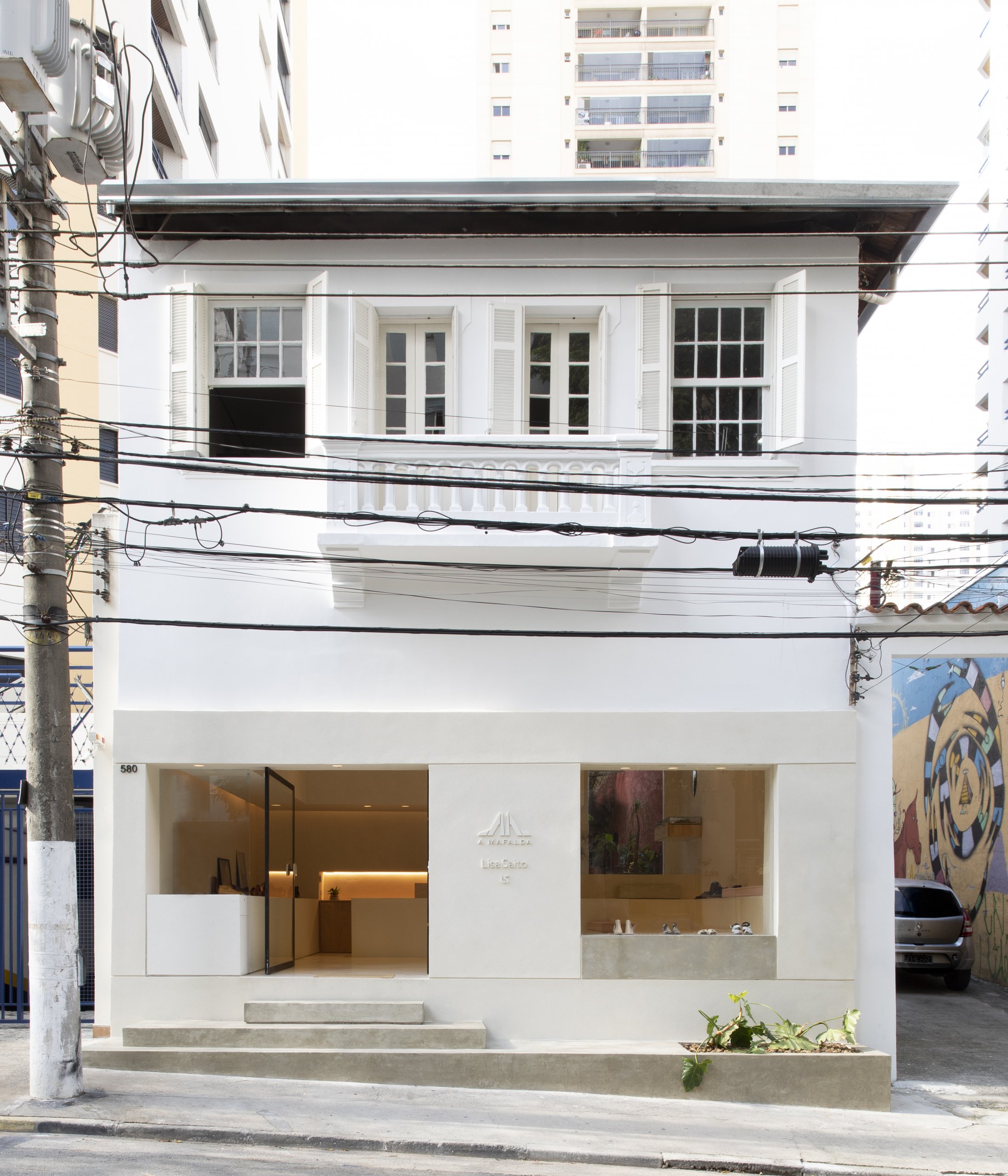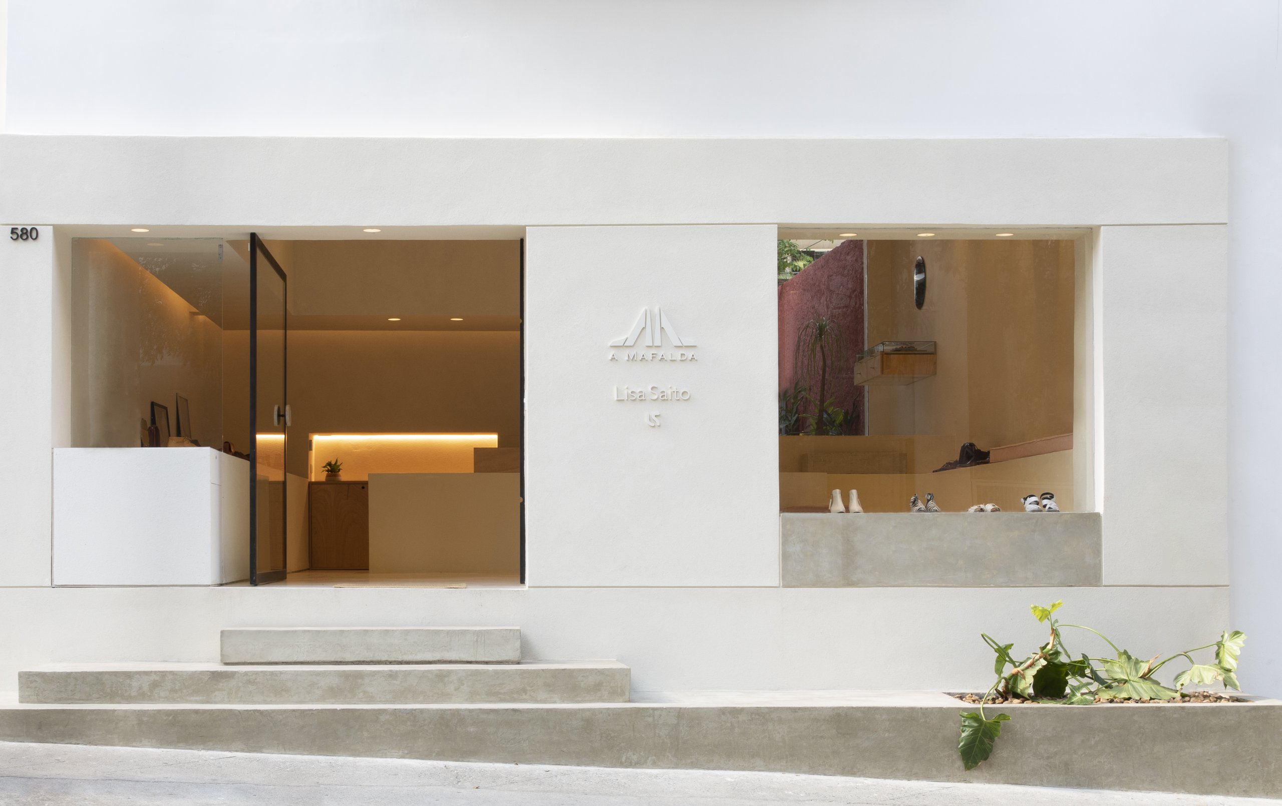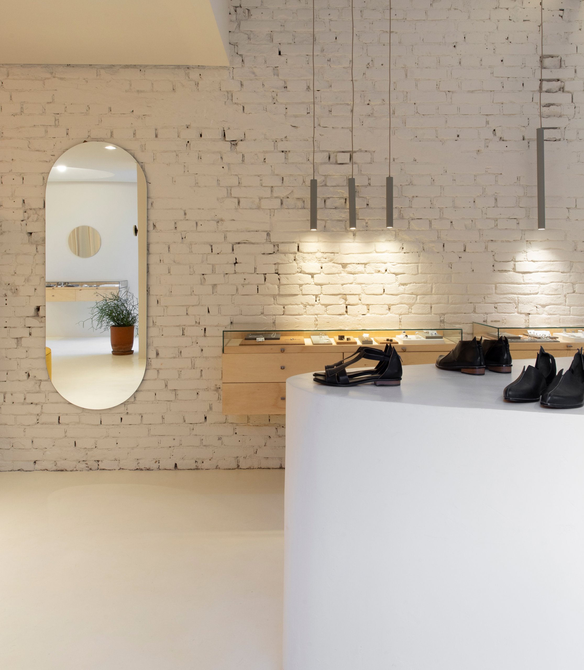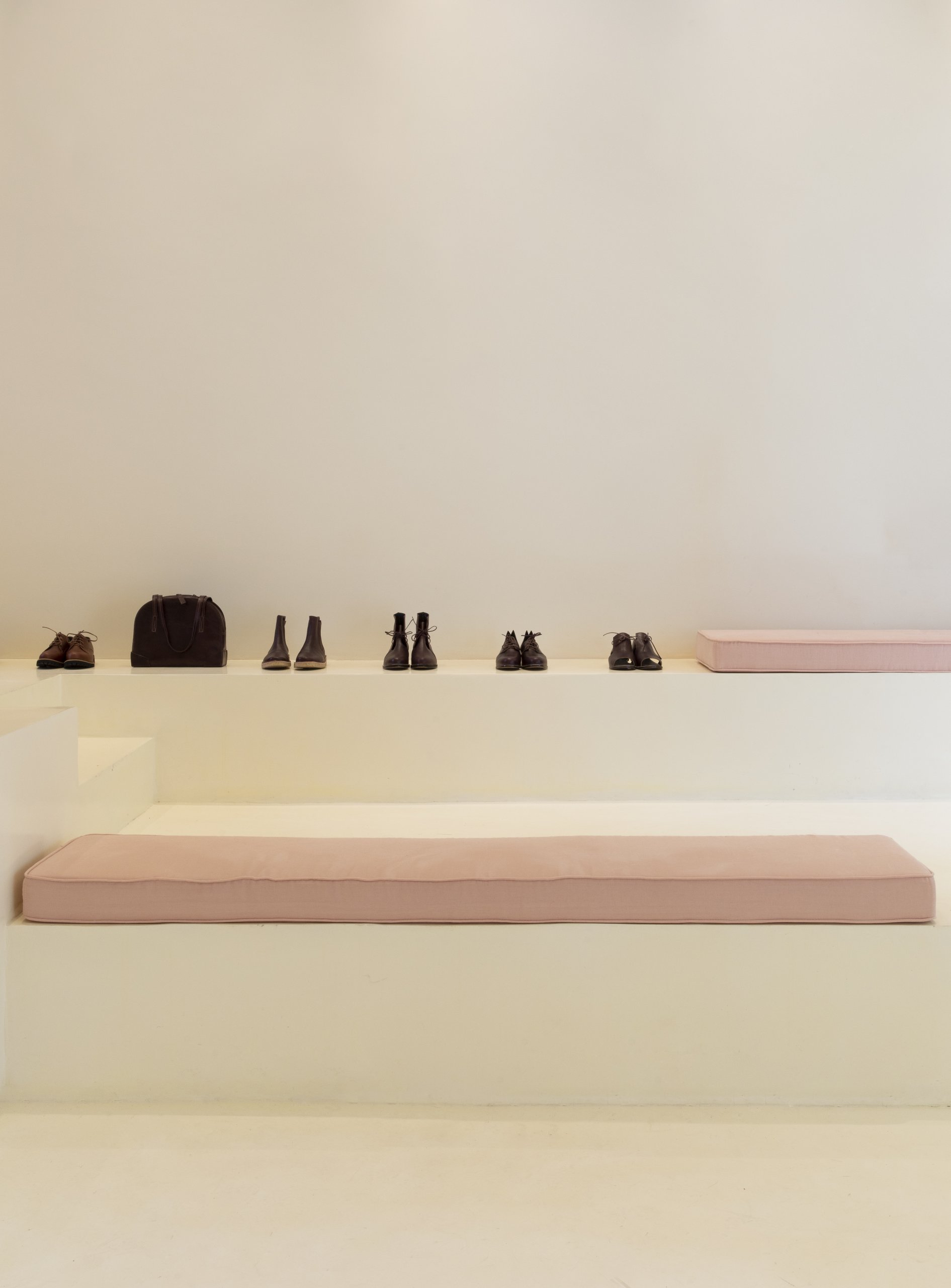 A arquitetura como expositor, guia a espacialidade da loja. Unindo o existe com a intervenção proposta, o espaço se forma pelo seu percurso. Este é guiado pelos distintos níveis em que estão expostos os sapatos. O caminho delimitado integra os dois ambientes, utilizando de elementos como cortinas e domos para formalizar esta integração espacial de maneira a se criar uma unidade para a loja.