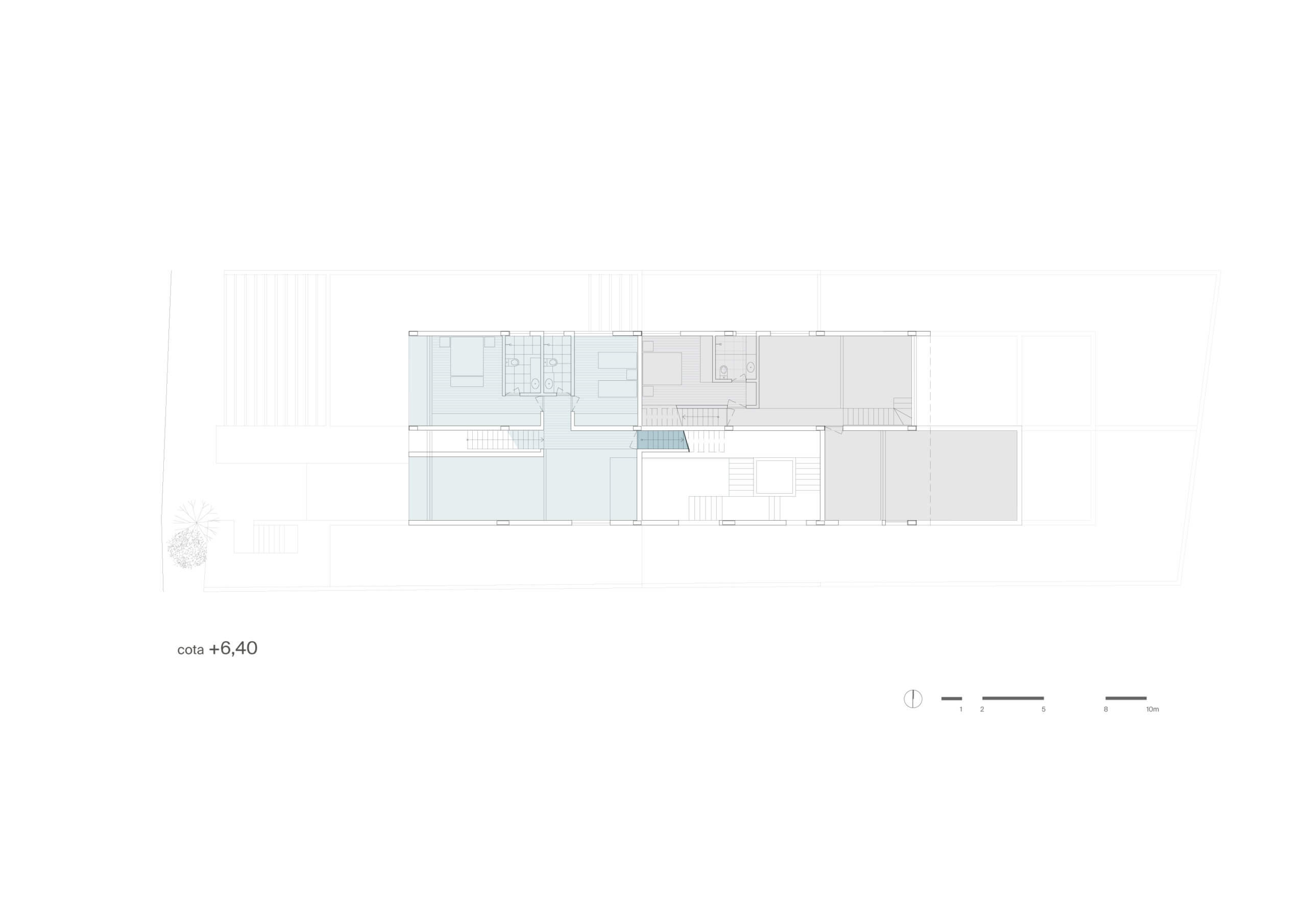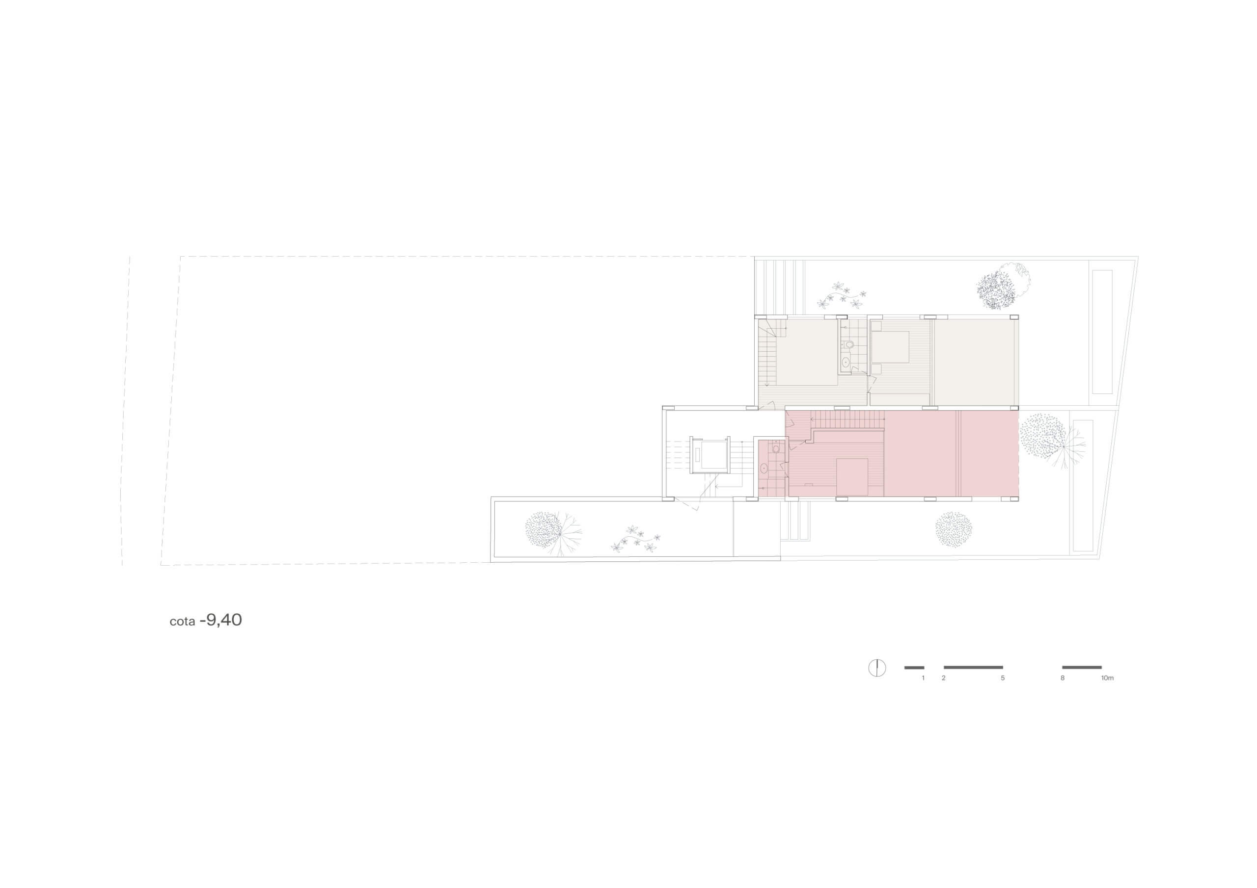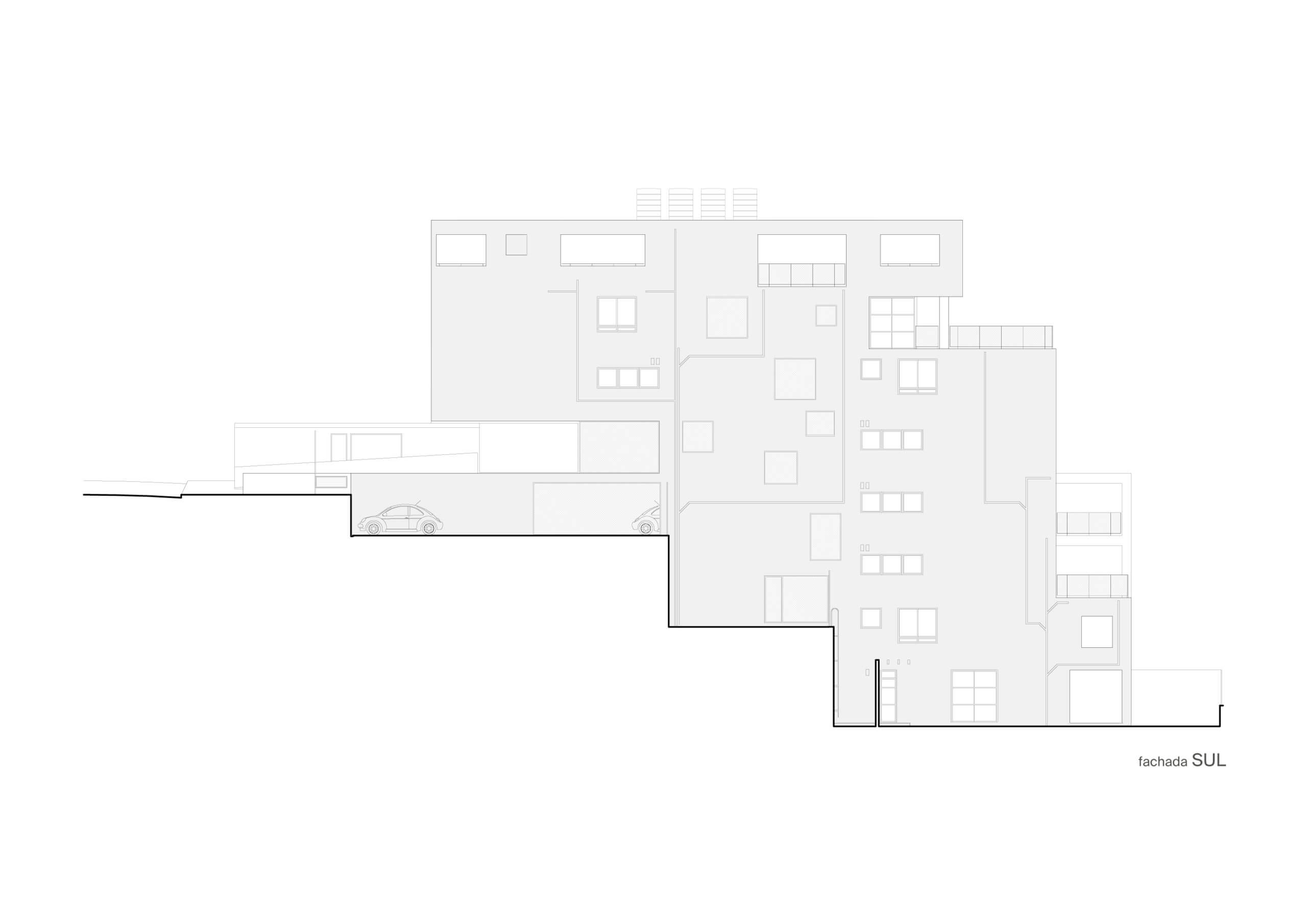 O edifício se desenvolve a partir do nível da rua em quatro pavimentos para baixo, até atingir o patamar inferior do lote, e dois para cima, além da cobertura.
