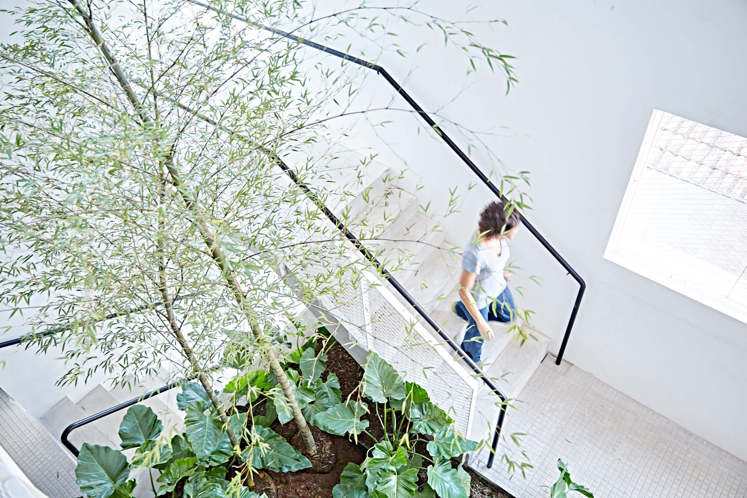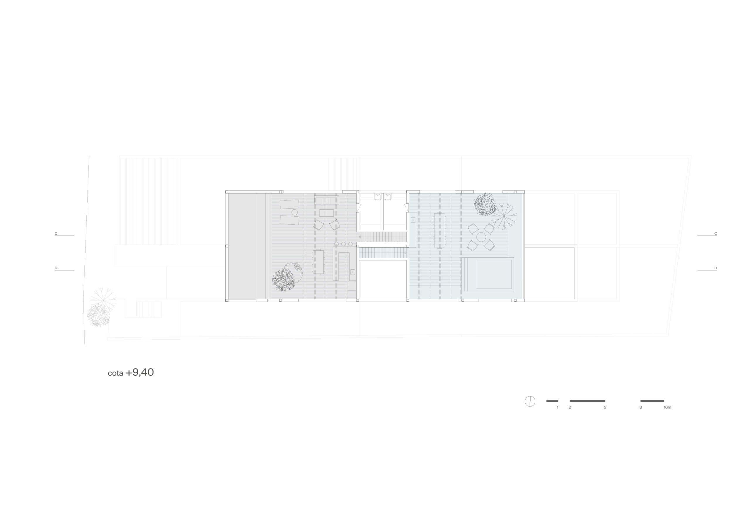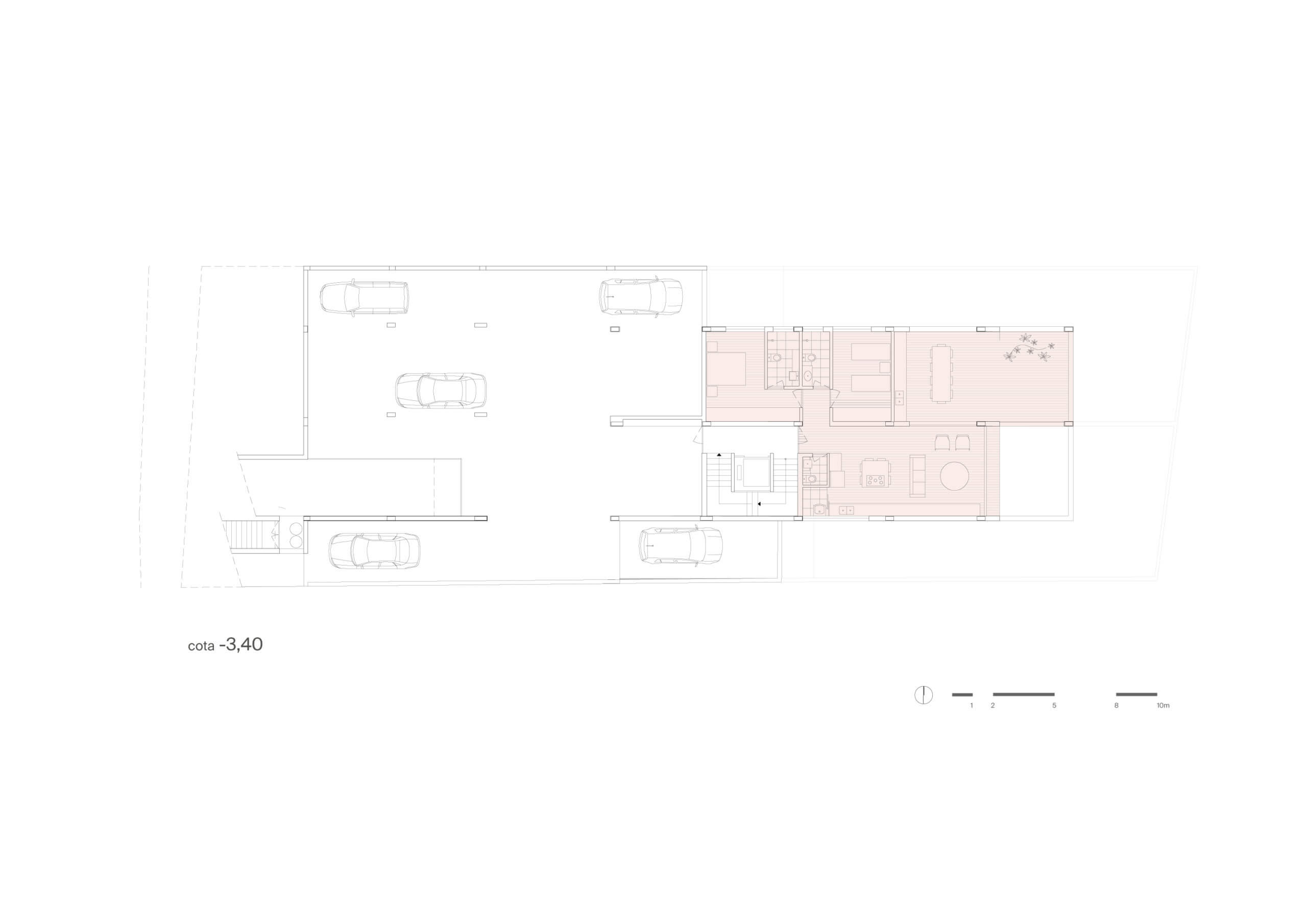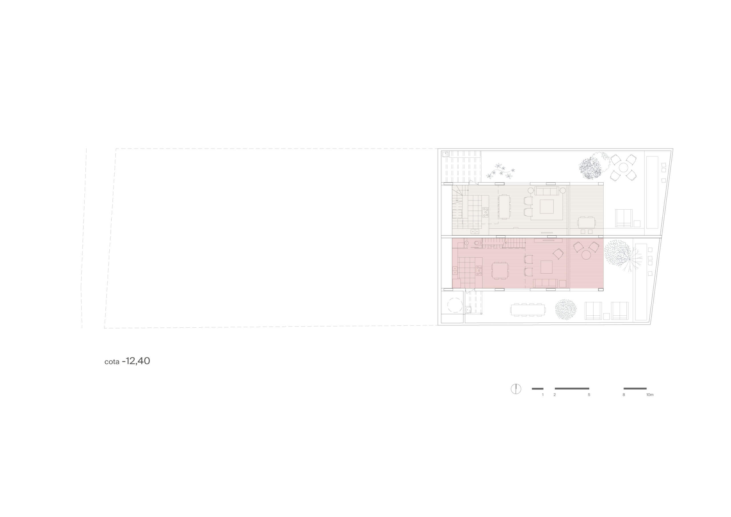 O edifício se desenvolve a partir do nível da rua em quatro pavimentos para baixo, até atingir o patamar inferior do lote, e dois para cima, além da cobertura.
