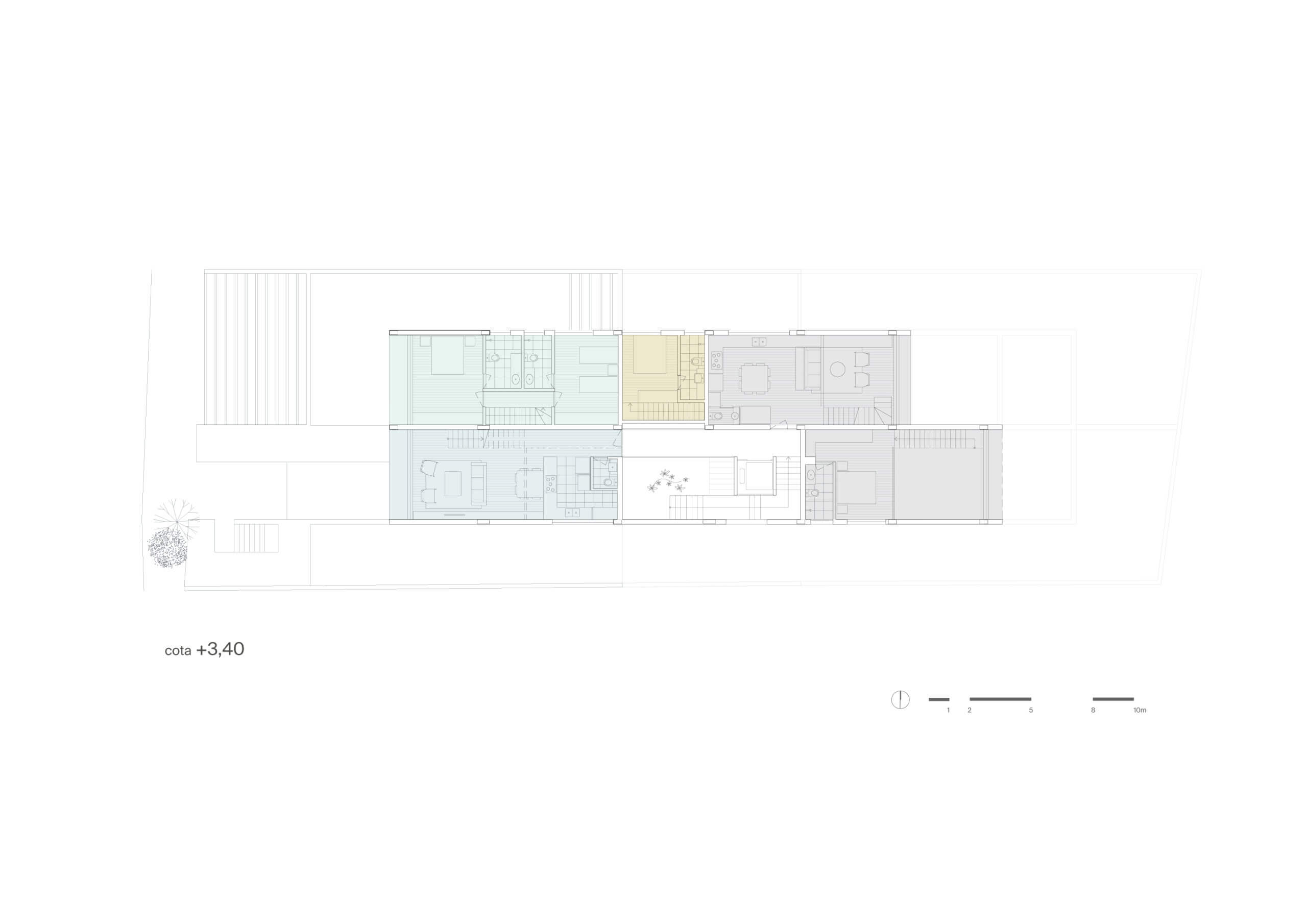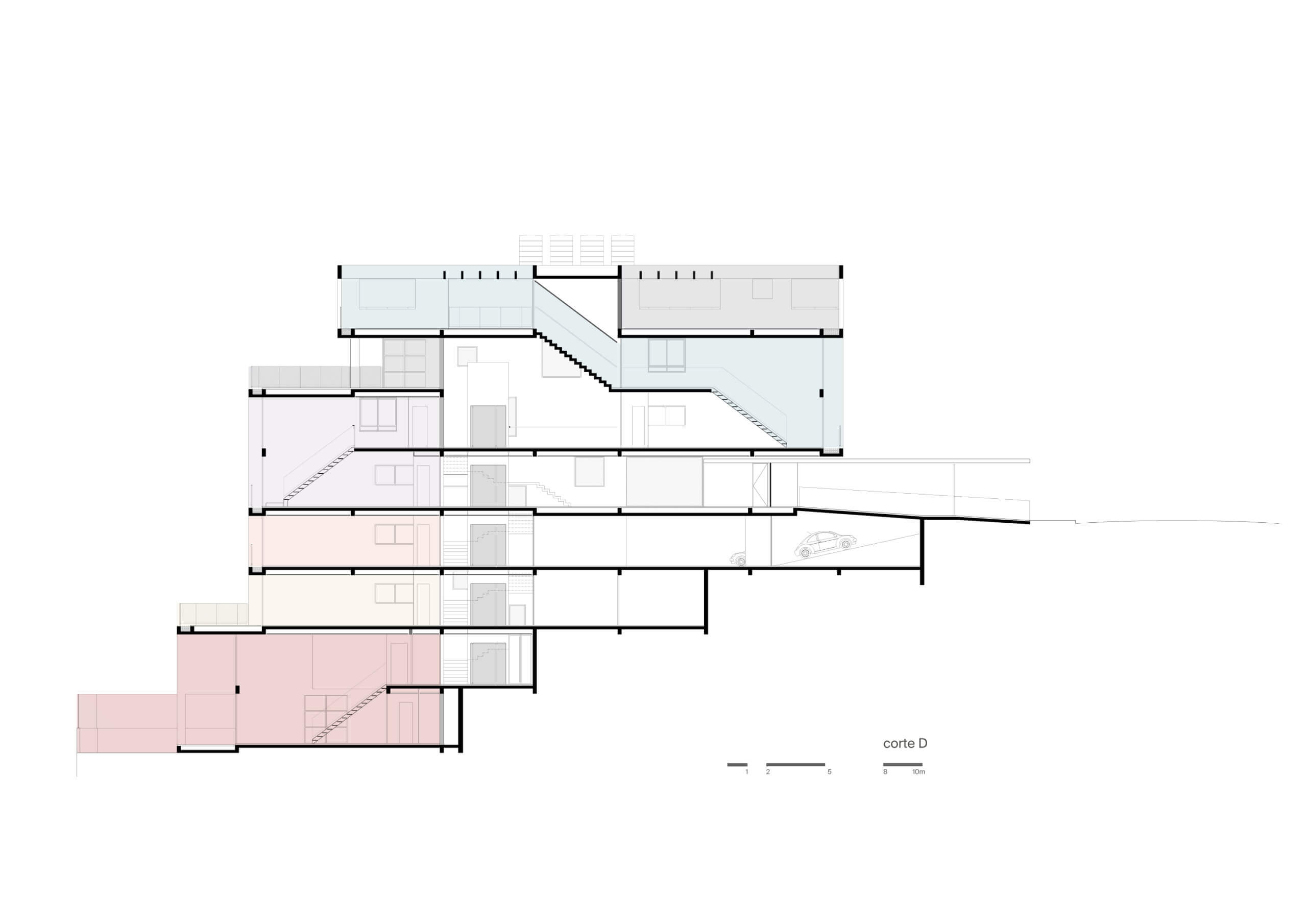 O projeto para este edifício de 8 apartamentos situado em um terreno em declive em São Paulo, propõe uma alternativa para a moradia coletiva vertical na cidade, ao tratar o conjunto das unidades do edifício como um agrupamento de casas sobrepostas encaixadas, formando uma “vila vertical”.