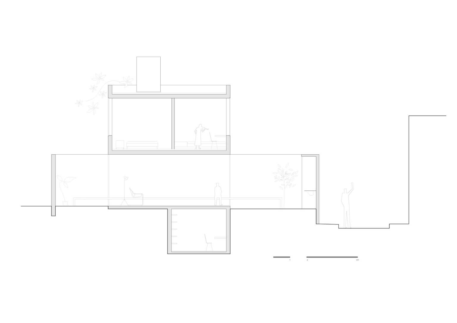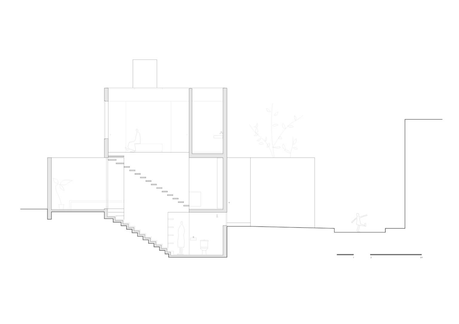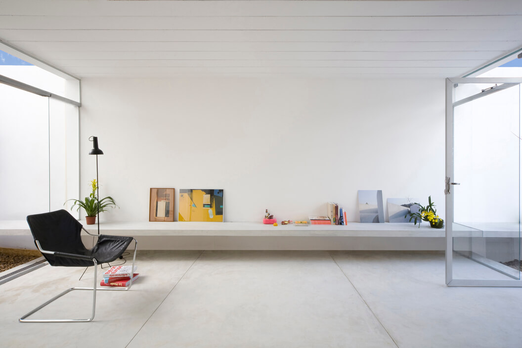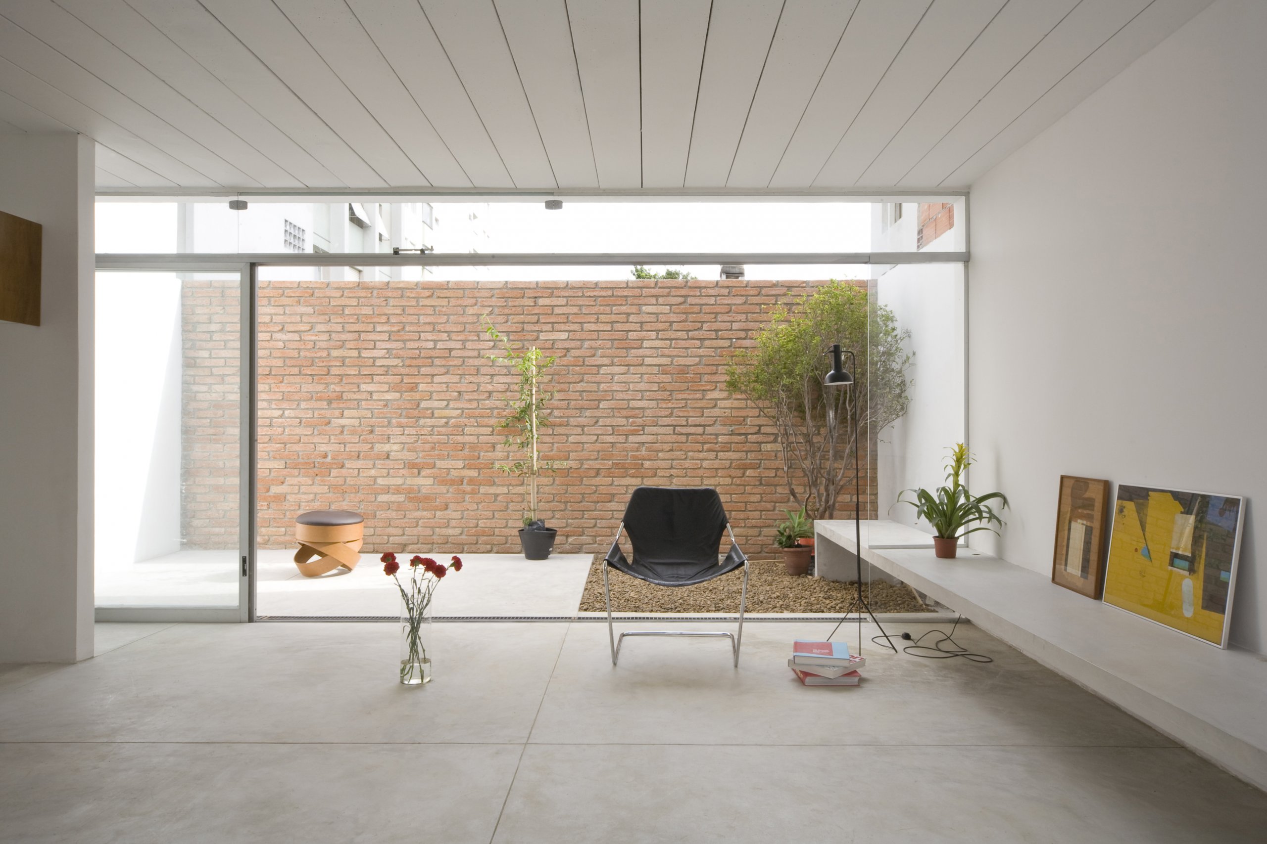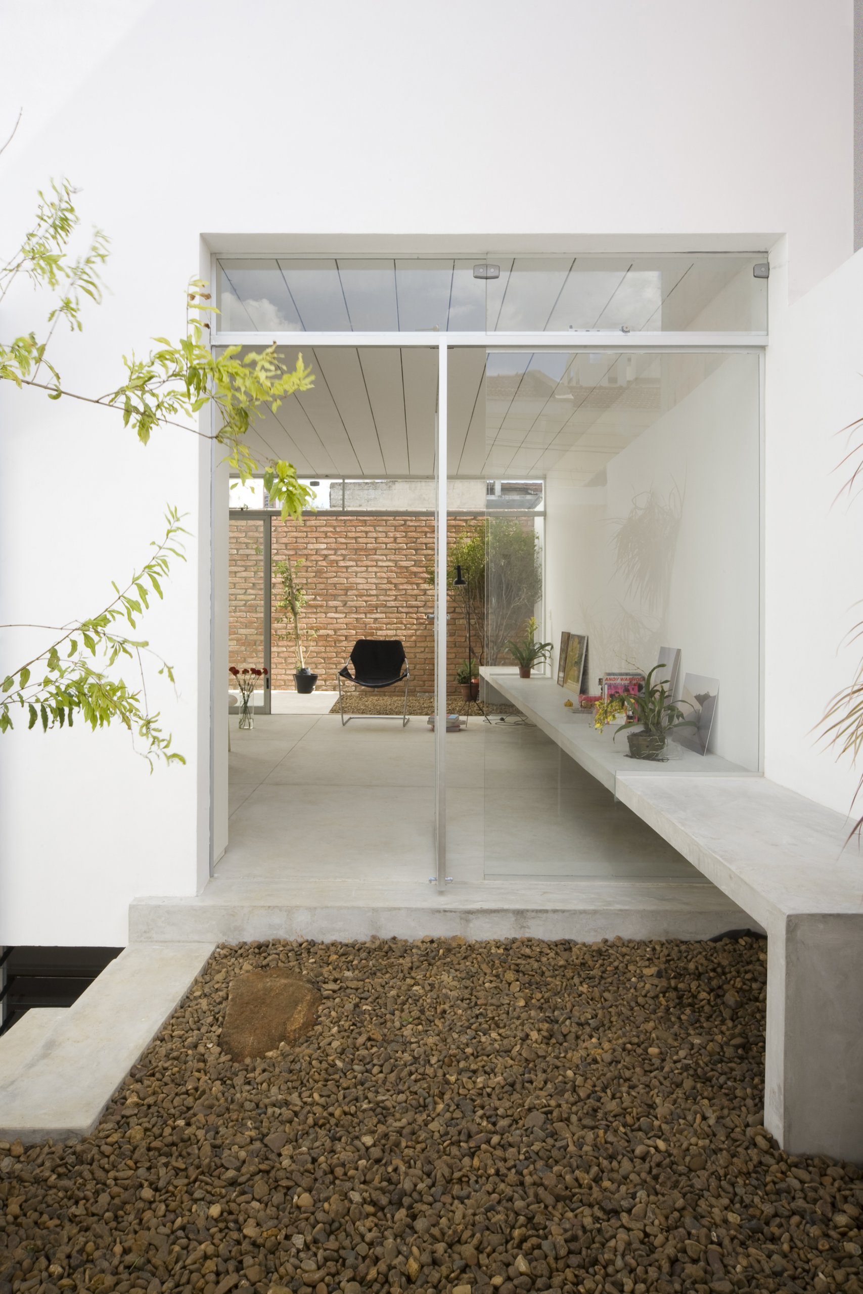 Contradição: uma grande casa num pequeno terreno; ele quer privacidade, ela quer uma casa aberta e luminosa. Solução: a casa se fecha para o exterior e abre totalmente para jardins internos, o espaço interno e externo se misturam. Resultado: Um cubo branco rodeado de plantas e luz.