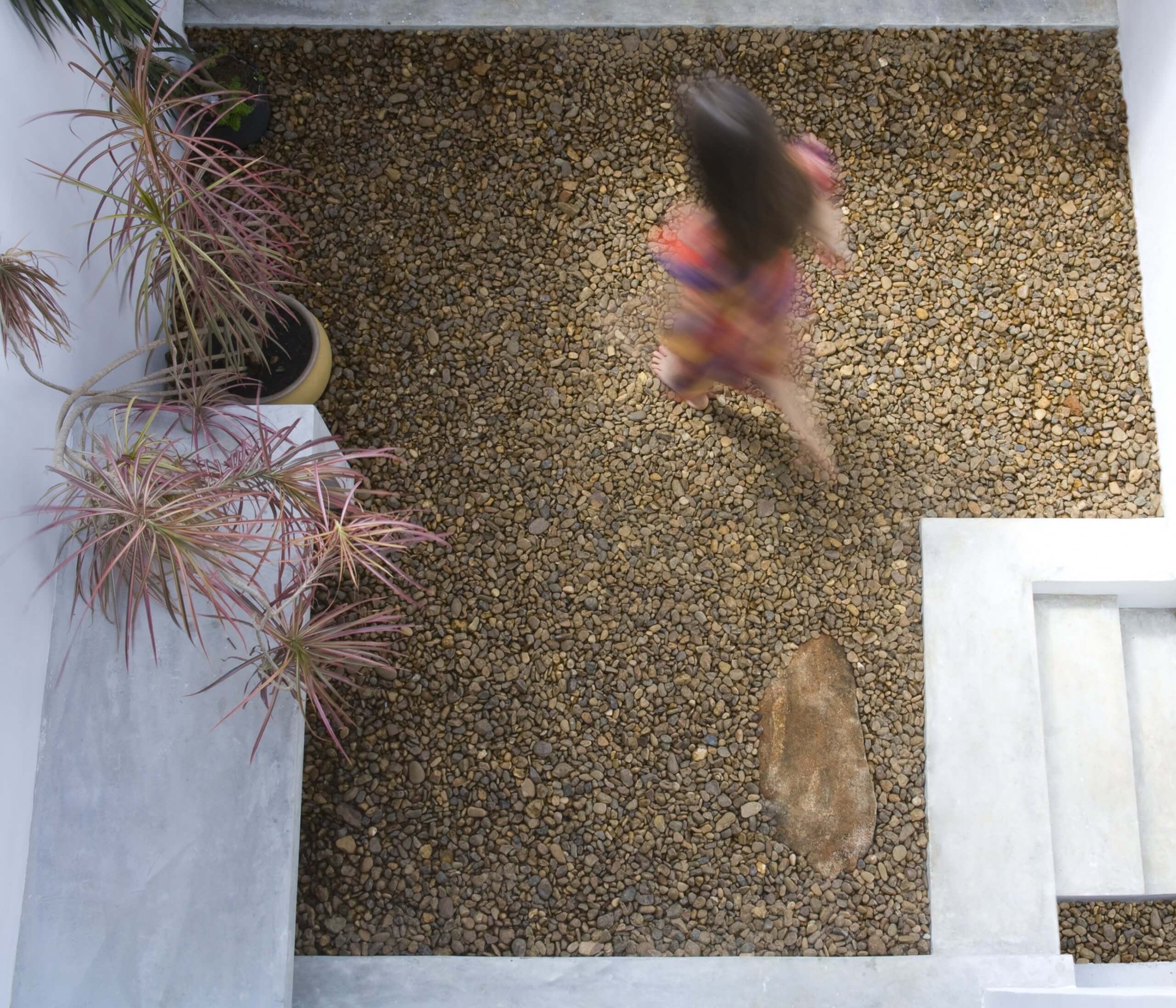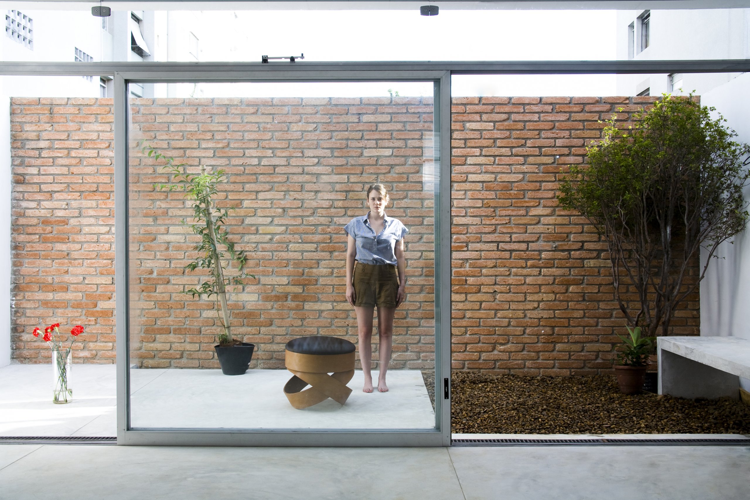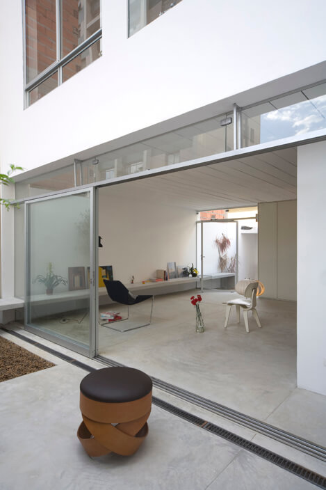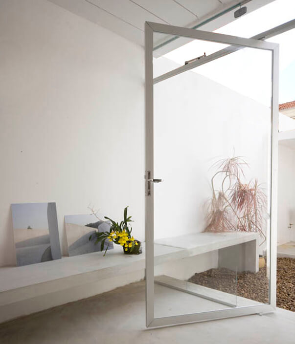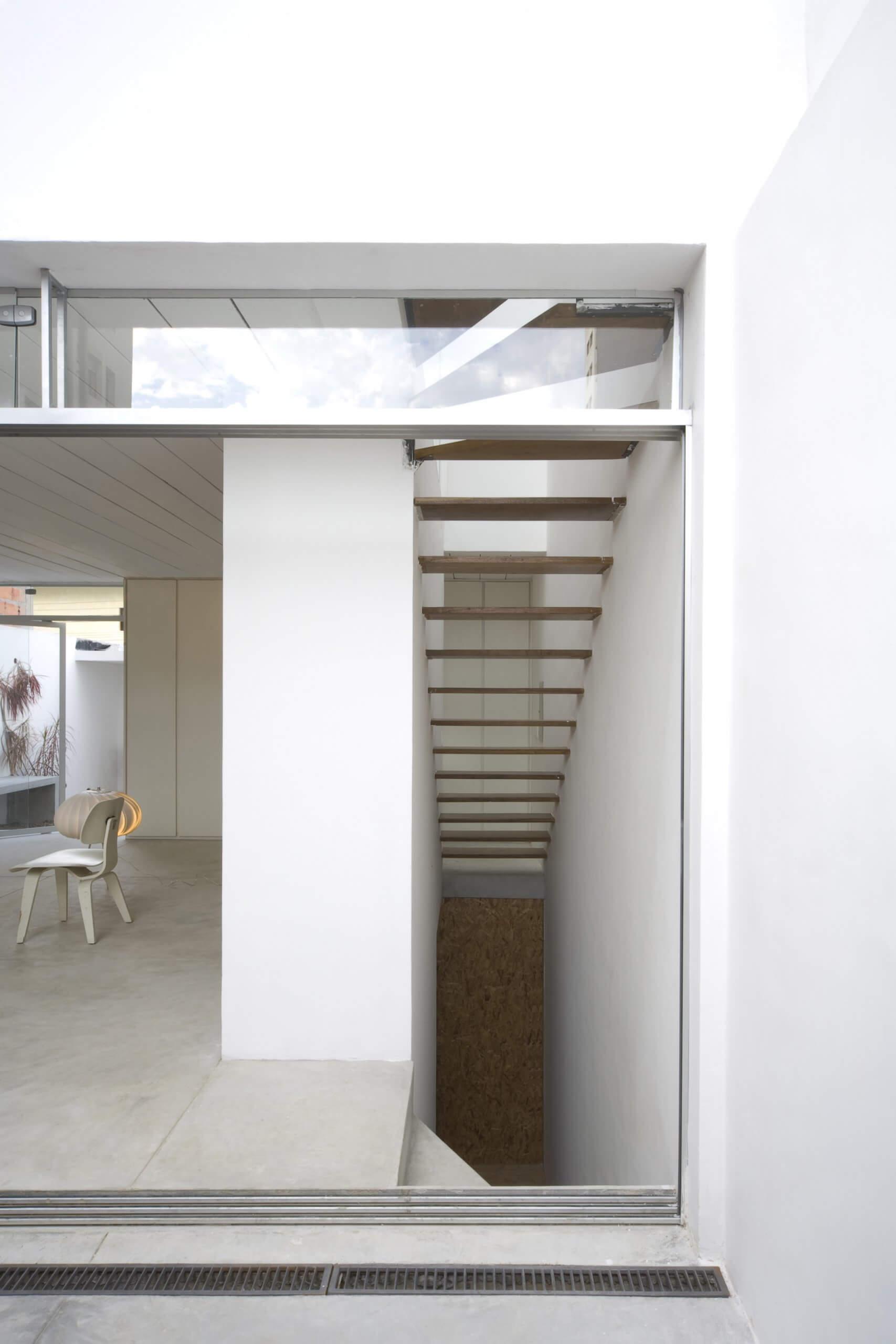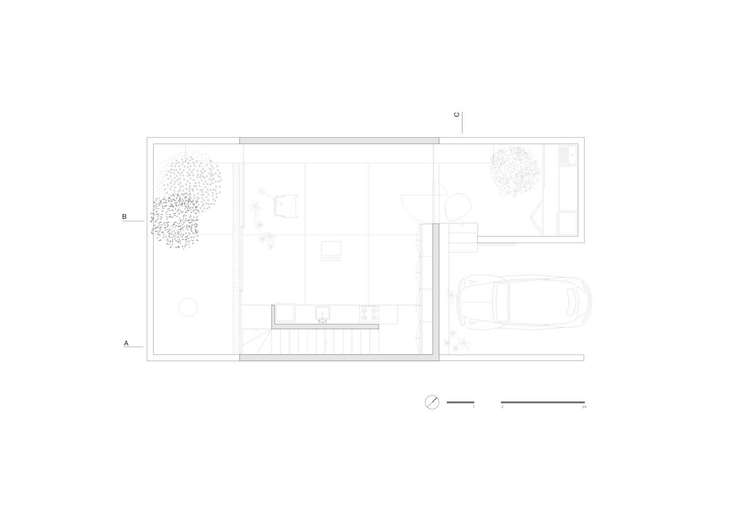 Contradição: uma grande casa num pequeno terreno; ele quer privacidade, ela quer uma casa aberta e luminosa. Solução: a casa se fecha para o exterior e abre totalmente para jardins internos, o espaço interno e externo se misturam. Resultado: Um cubo branco rodeado de plantas e luz.