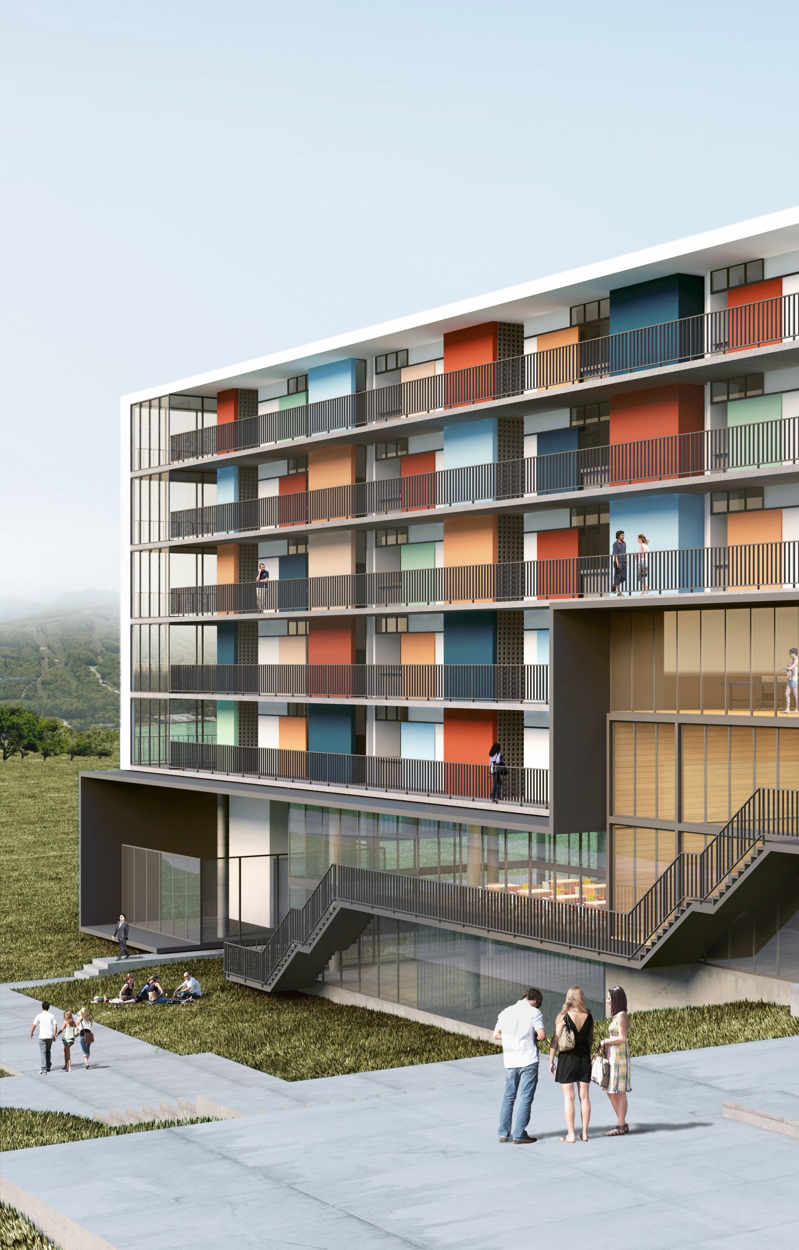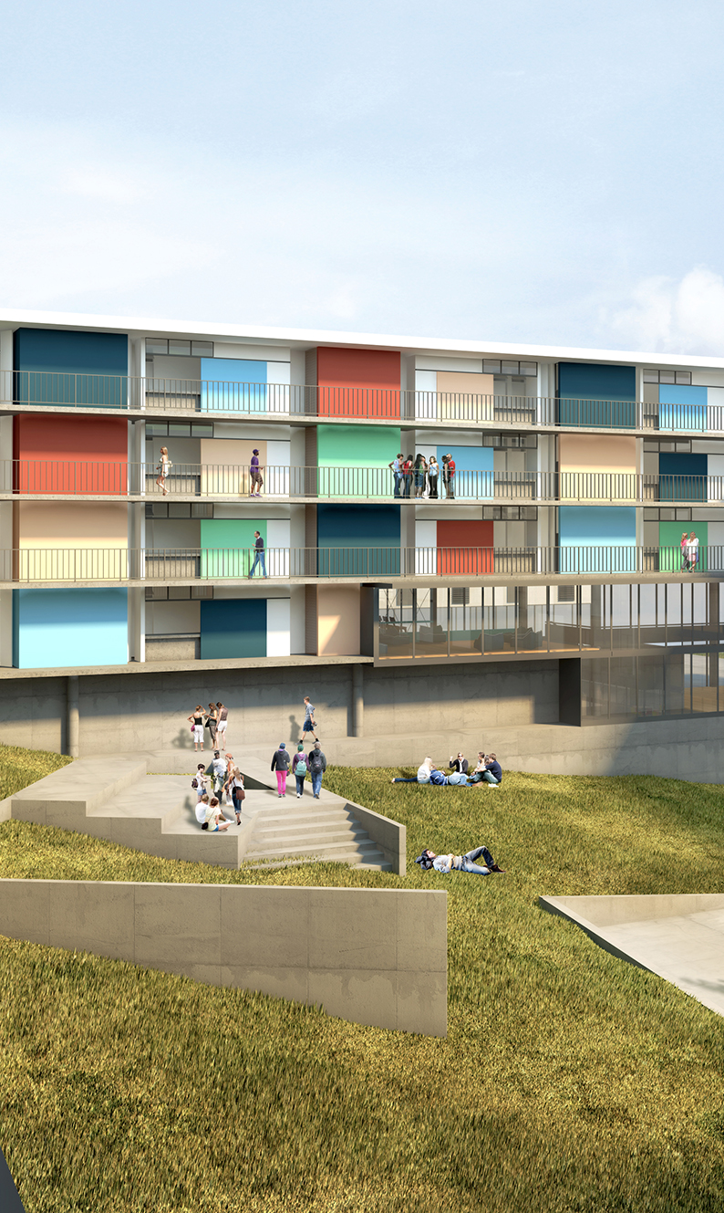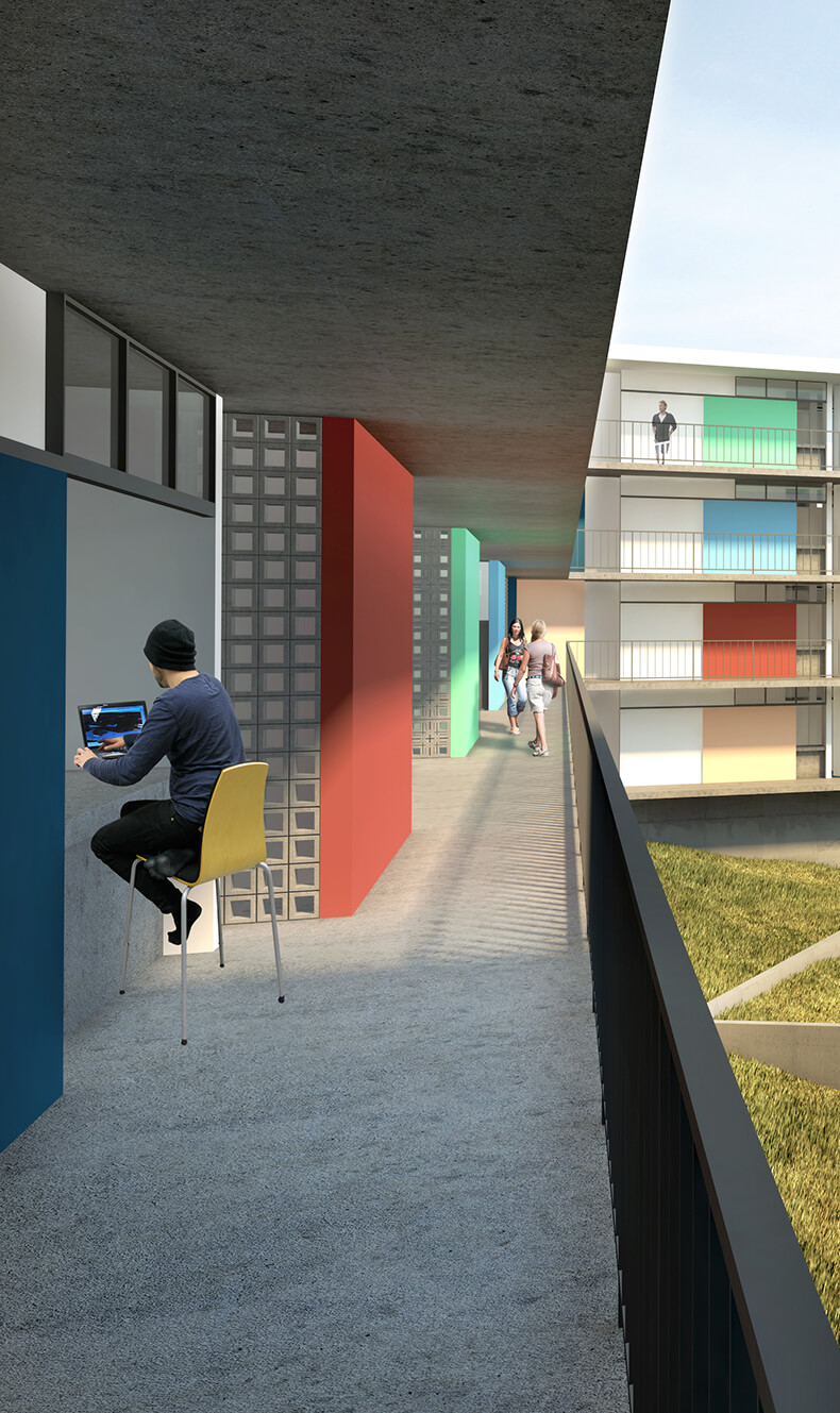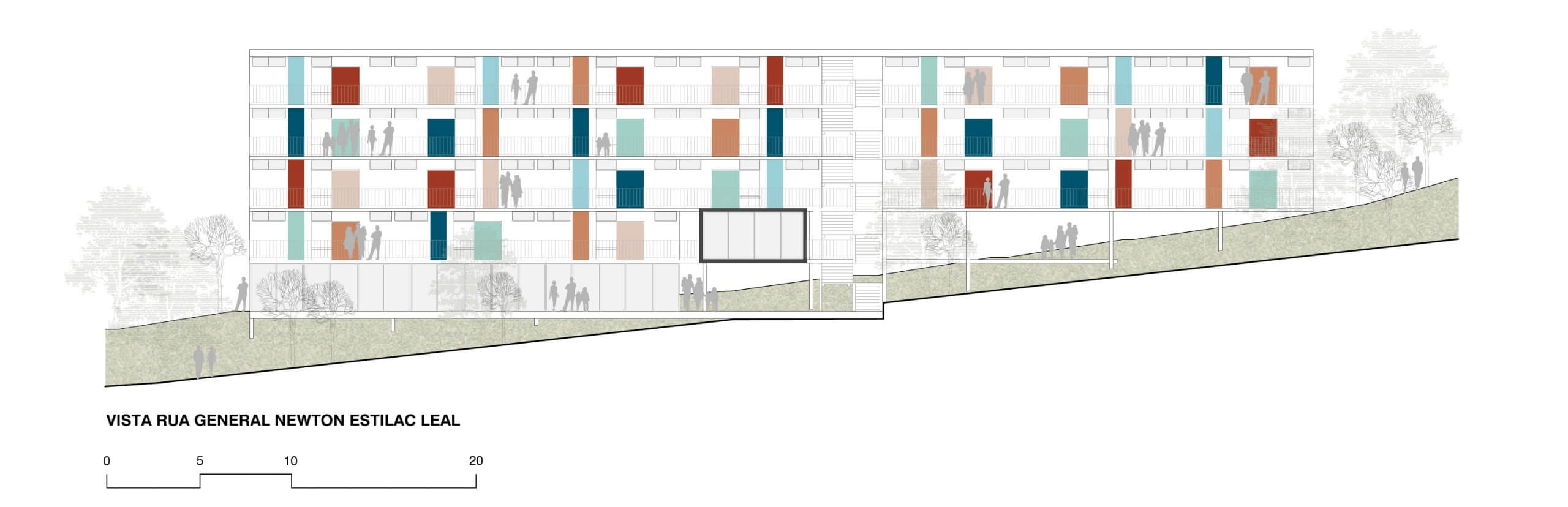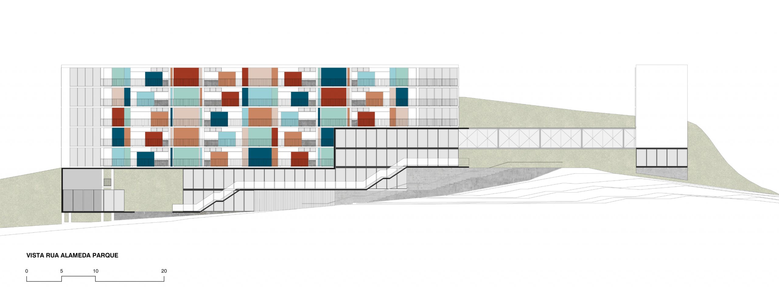 Do legado moderno tomamos os pilotis como estratégia para enfrentar o terreno em forte declive. A solução, do Conjunto Pedregulho e da Casa de Vidro, permite acomodar o espaço habitado sobre a terra virgem sem maiores trabalhos geotécnicos. Além da memória arquitetônica e das tradições construtivas, tal estratégia, ao liberar o solo, permite aproveitar os vãos resultantes como oportunidade para ‘encaixar’ no próprio edifício, numa estrutura parasita sob as habitações, o programa coletivo que as serve, propondo o diálogo com o futuro. Por fim, o terreno recebe, onde convêm, algumas correções topográficas em platôs.