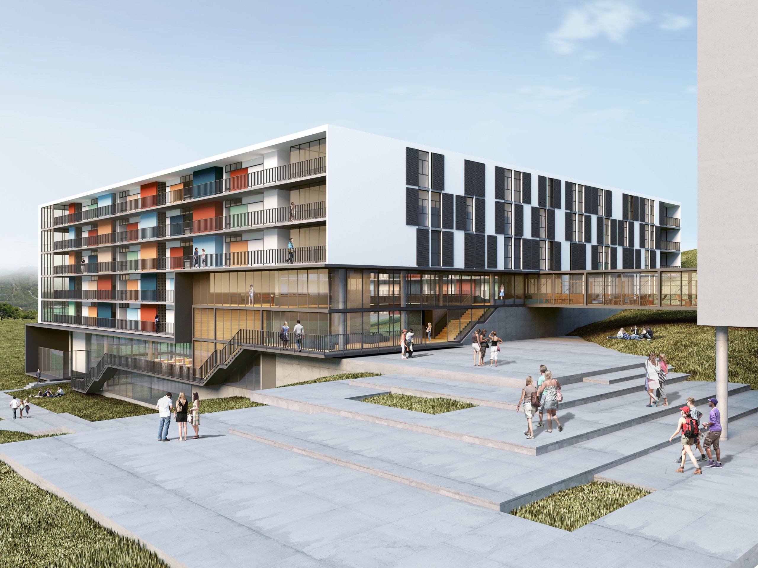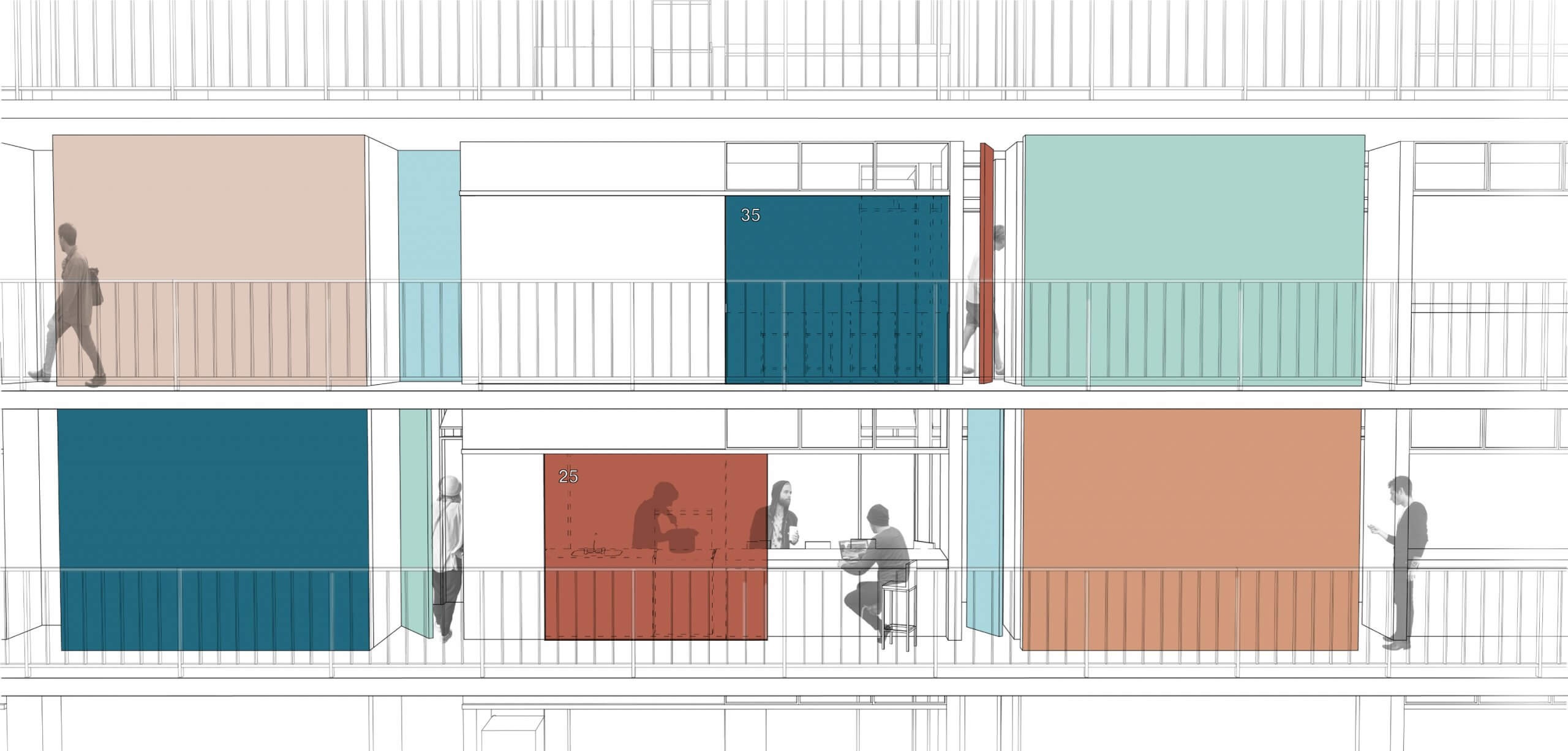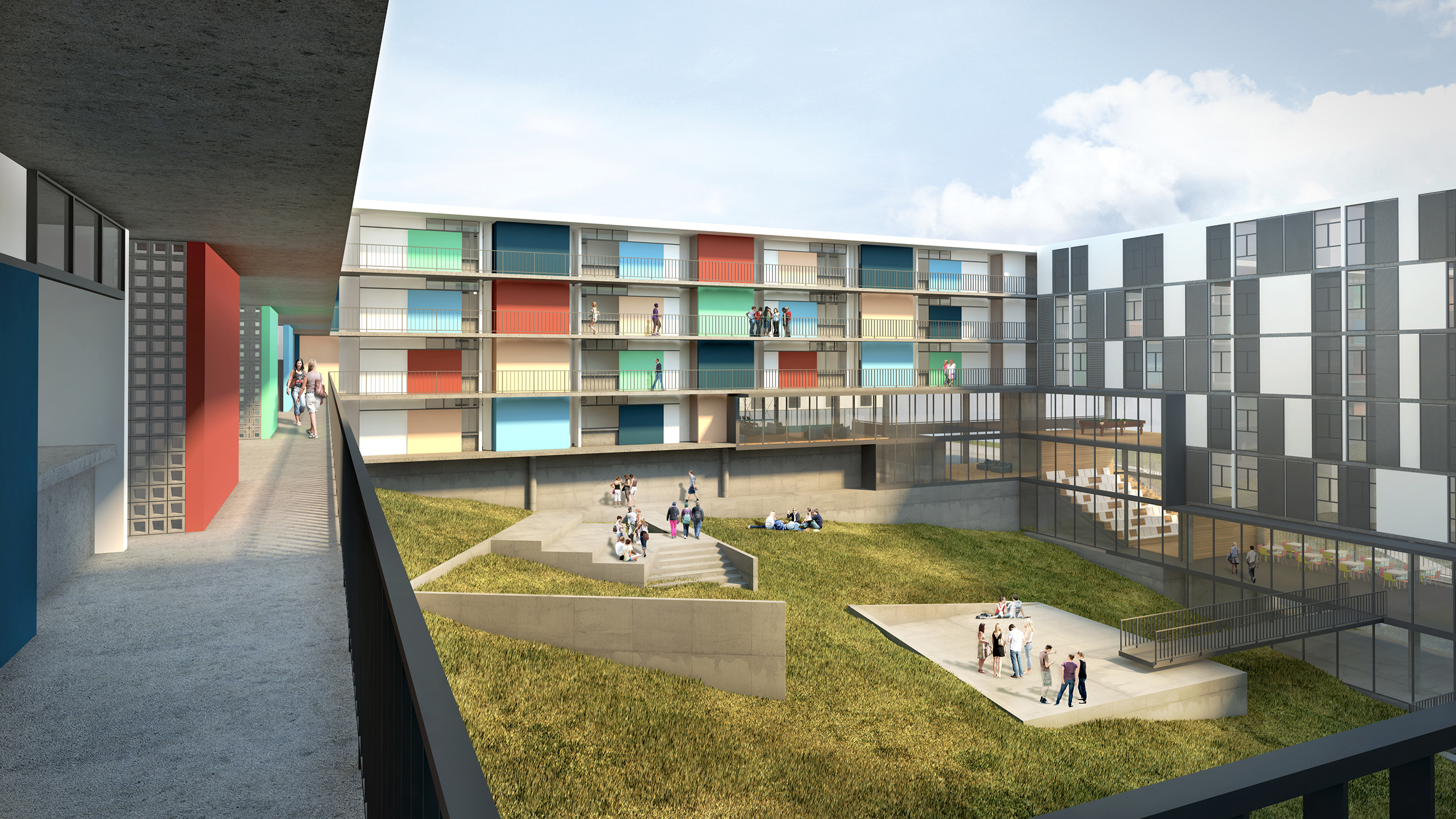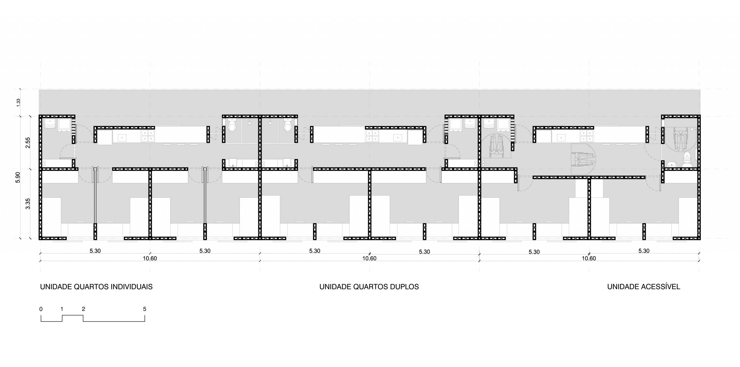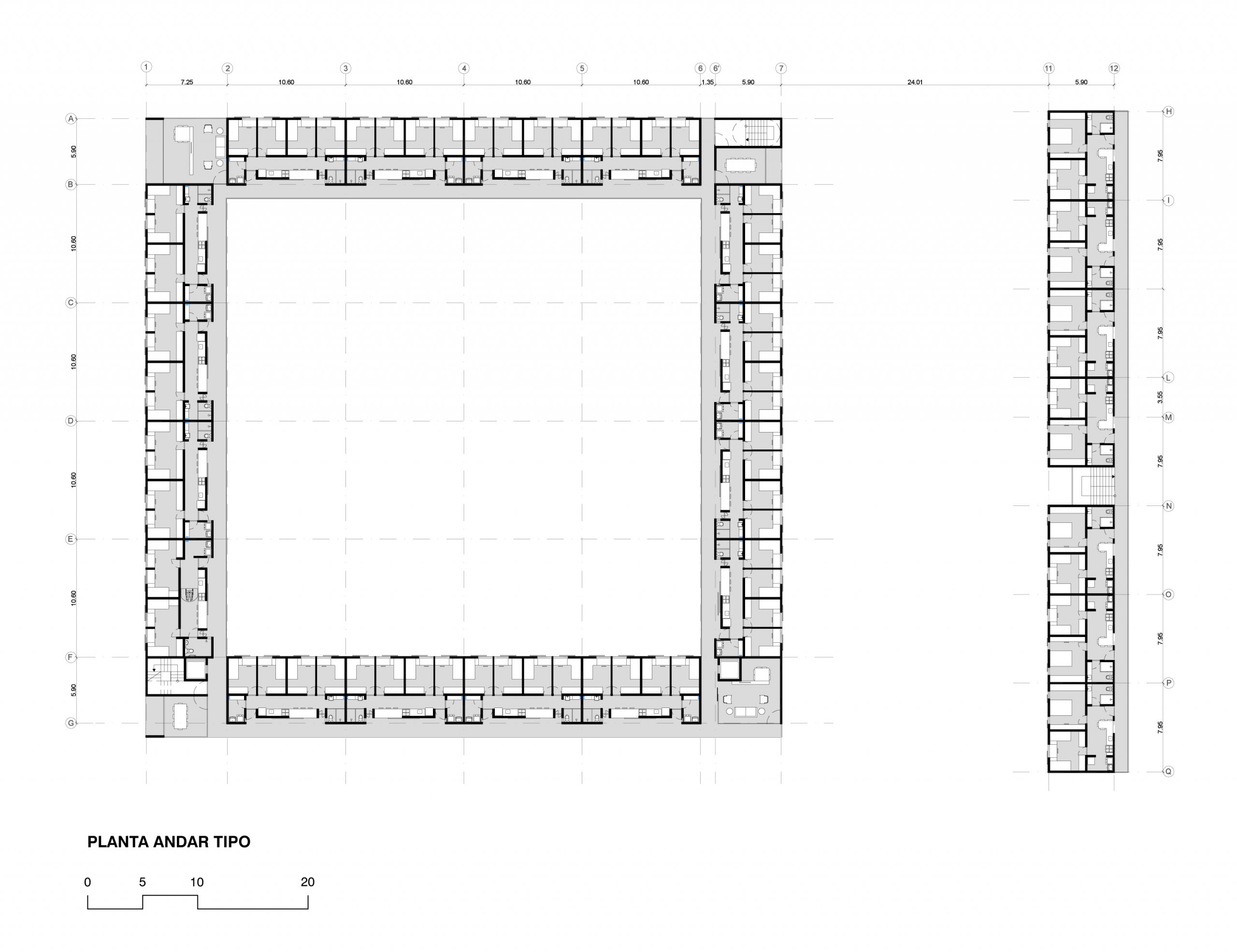 Do legado moderno tomamos os pilotis como estratégia para enfrentar o terreno em forte declive. A solução, do Conjunto Pedregulho e da Casa de Vidro, permite acomodar o espaço habitado sobre a terra virgem sem maiores trabalhos geotécnicos. Além da memória arquitetônica e das tradições construtivas, tal estratégia, ao liberar o solo, permite aproveitar os vãos resultantes como oportunidade para ‘encaixar’ no próprio edifício, numa estrutura parasita sob as habitações, o programa coletivo que as serve, propondo o diálogo com o futuro. Por fim, o terreno recebe, onde convêm, algumas correções topográficas em platôs.