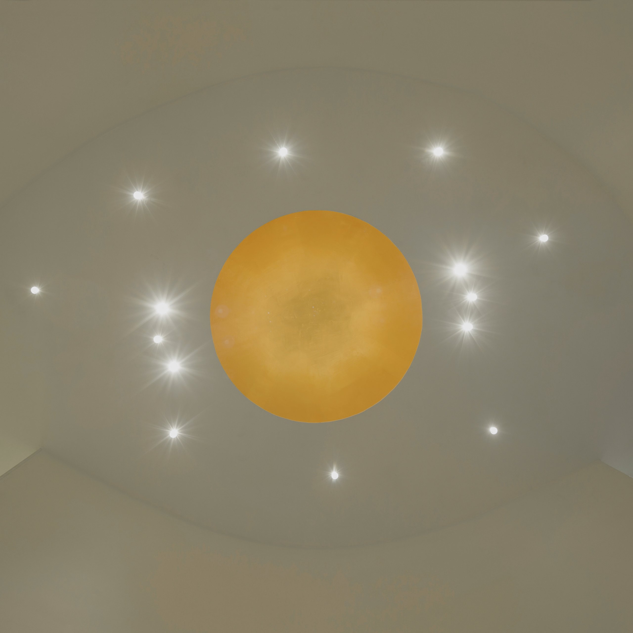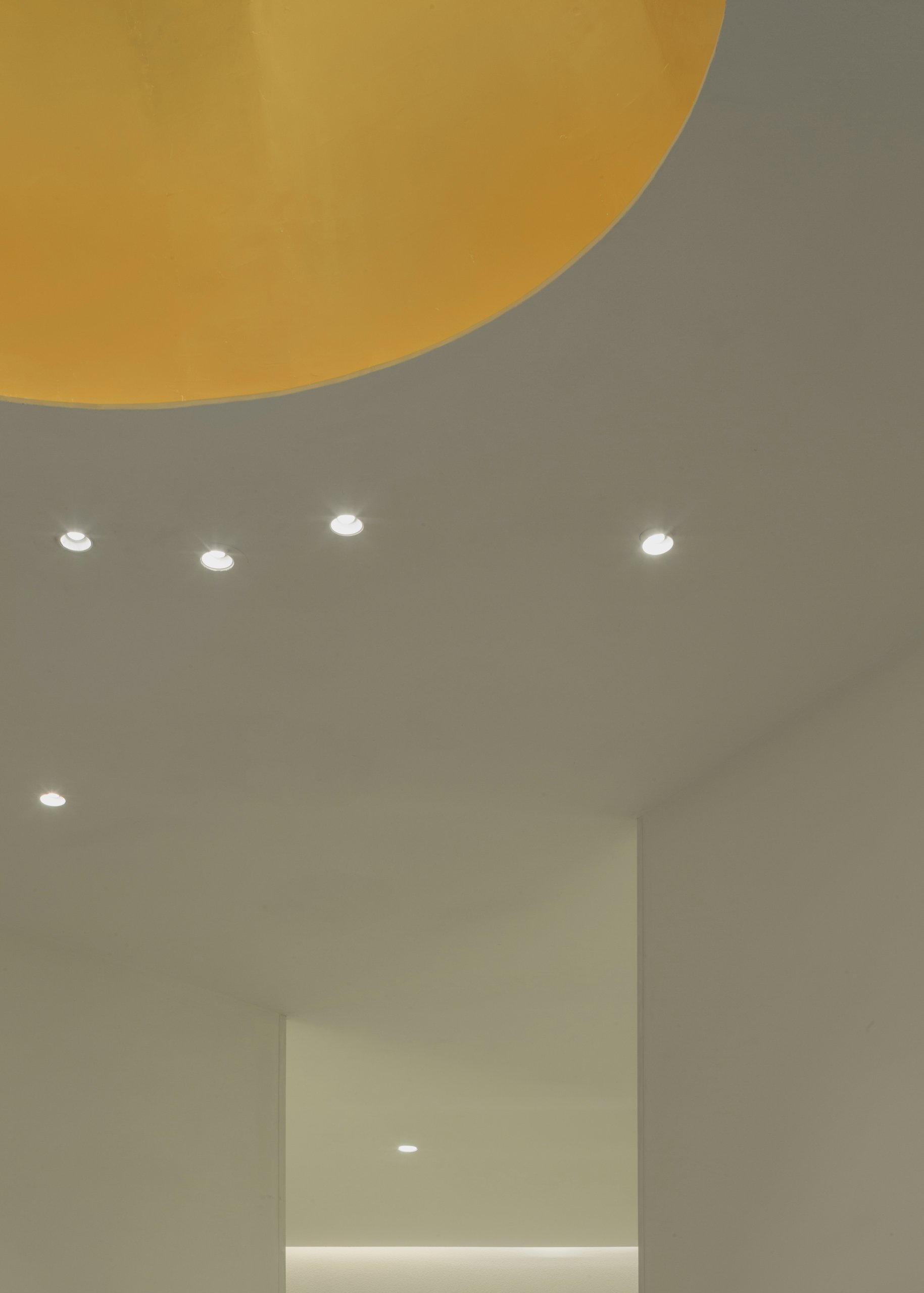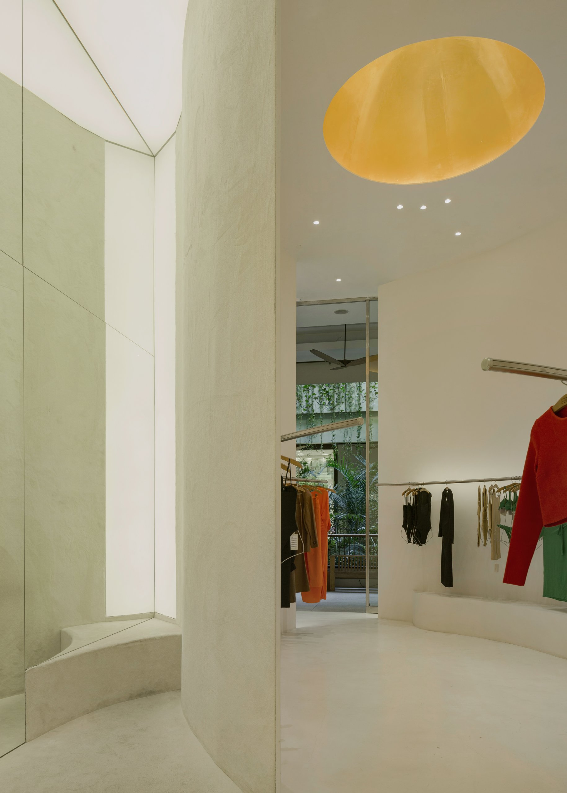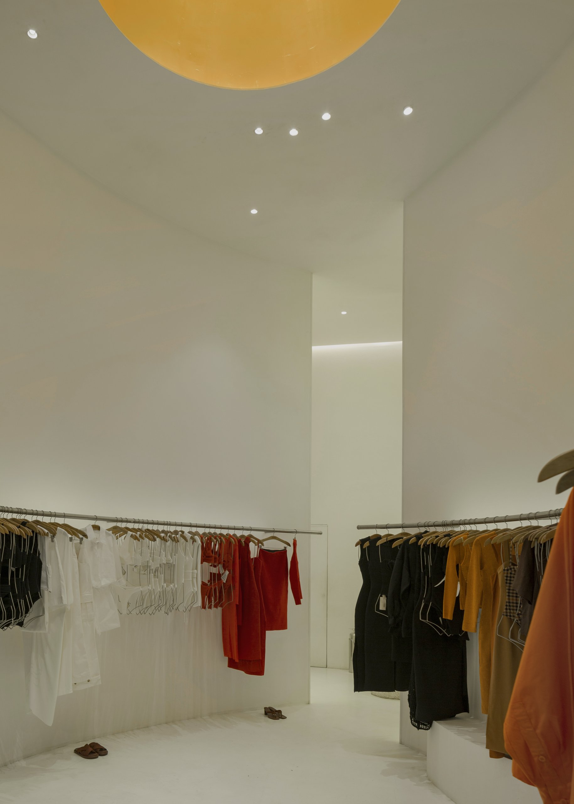 O espaço vazio é ocupado por uma grande elipse de seis metros de altura que organiza o espaço entre o centro, onde o grande sol ilumina as roupas, e o seu verso, onde se localizam vitrines e provadores. No centro a textura lisa e branca serve de anteparo a luz dourada, já no verso a textura rugosa rebate a luz e cria sombras.