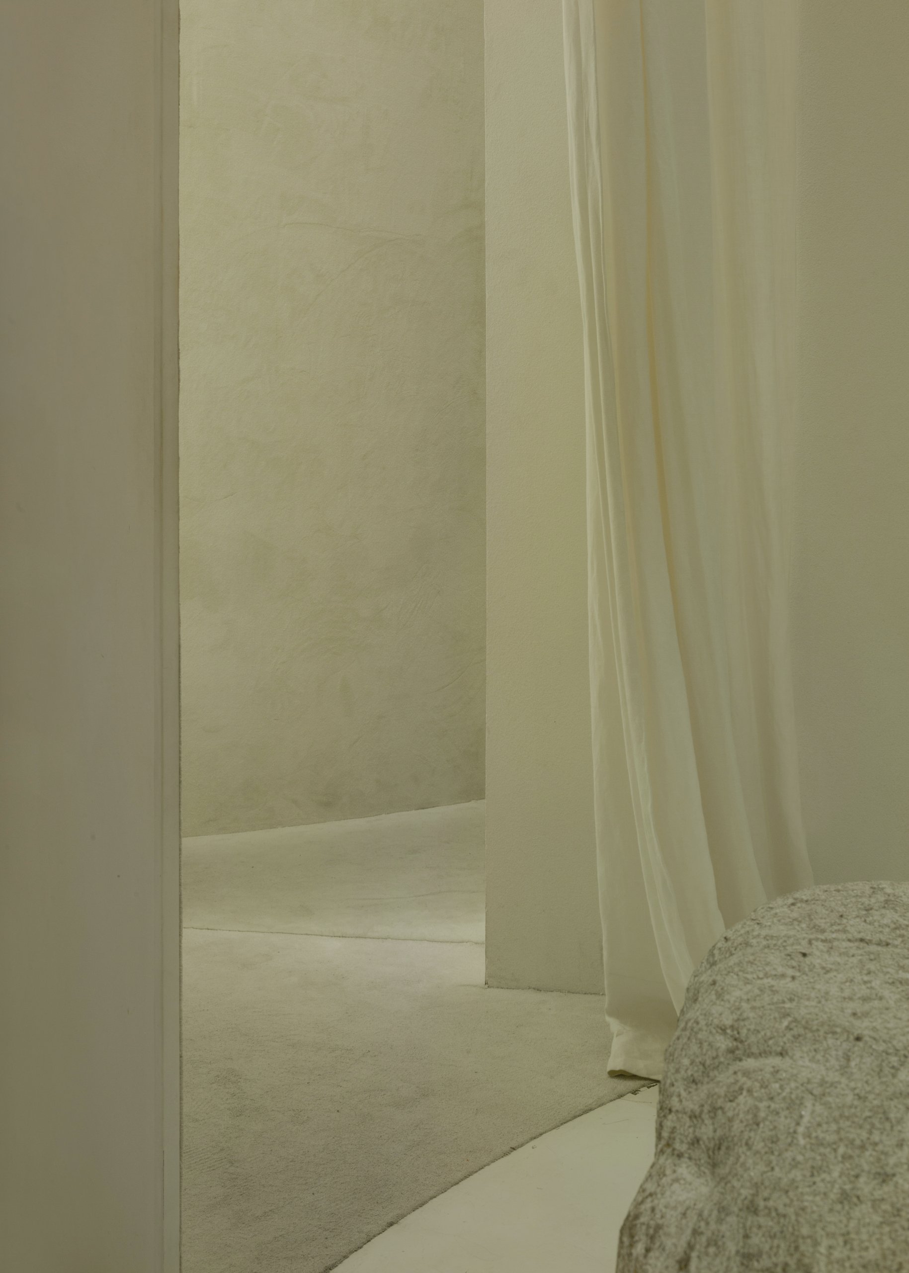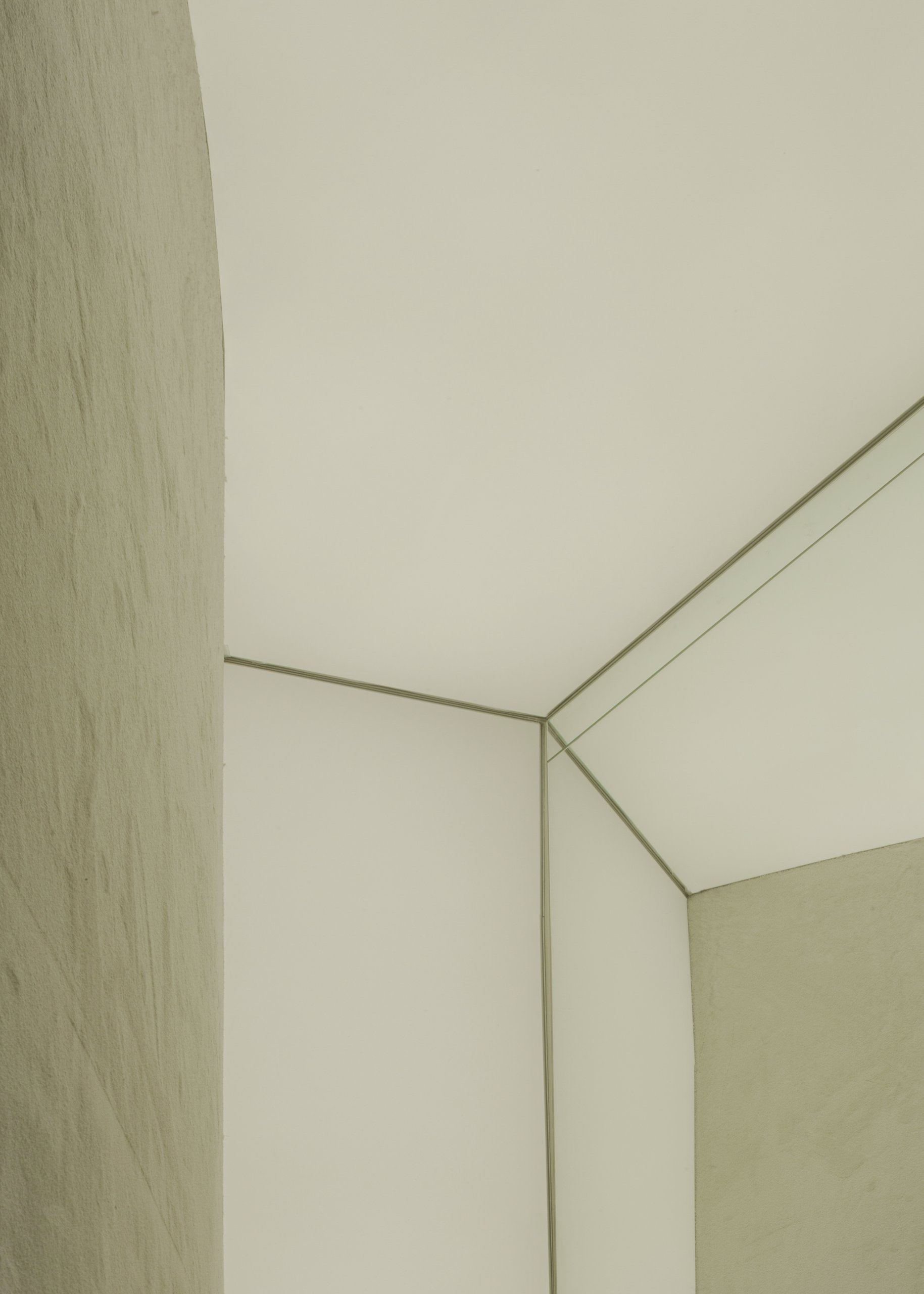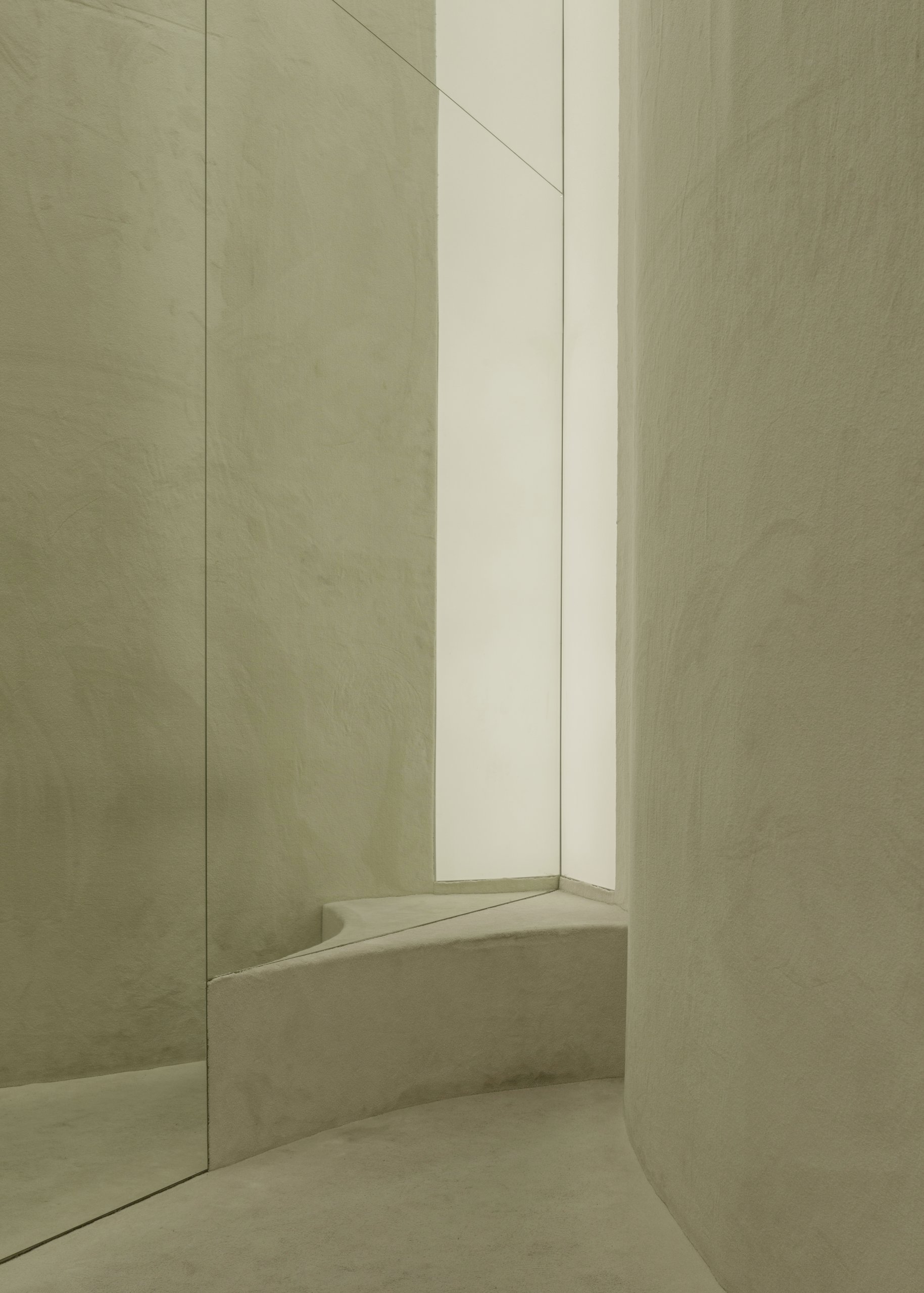 Carpete, piso, parede e banco, os provadores são completamente revestidos por apenas uma materialidade, cuja unidade combina os planos e desfaz as arestas. Do outro lado o grande espelho reflete a face curva e se move até se desfazer na aresta do fundo. No caixa, um monólito, que novamente apresenta o paradoxo entre o natural e o sintético, o liso e o áspero, um bloco preciso e ortogonal de inox e envolto pela grande pedra bruta, e assim se faz escultura.
