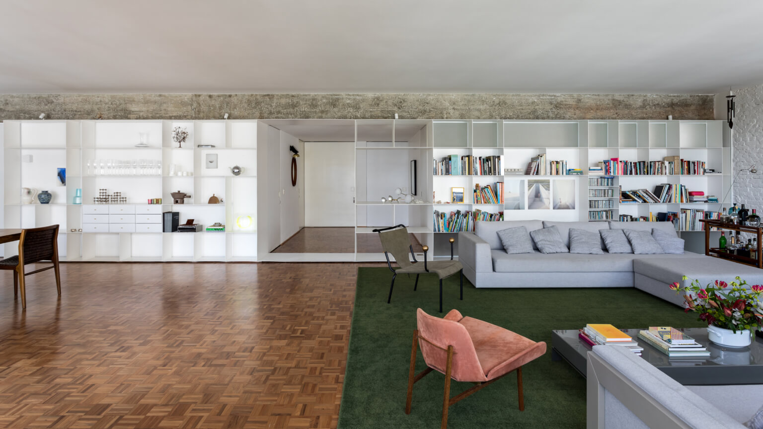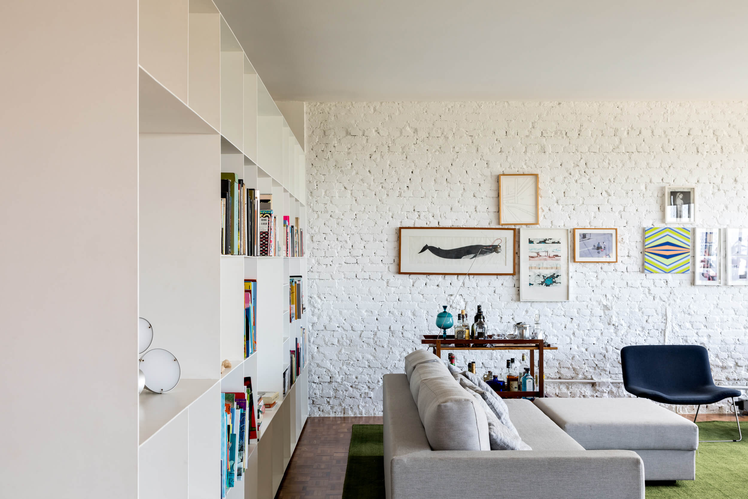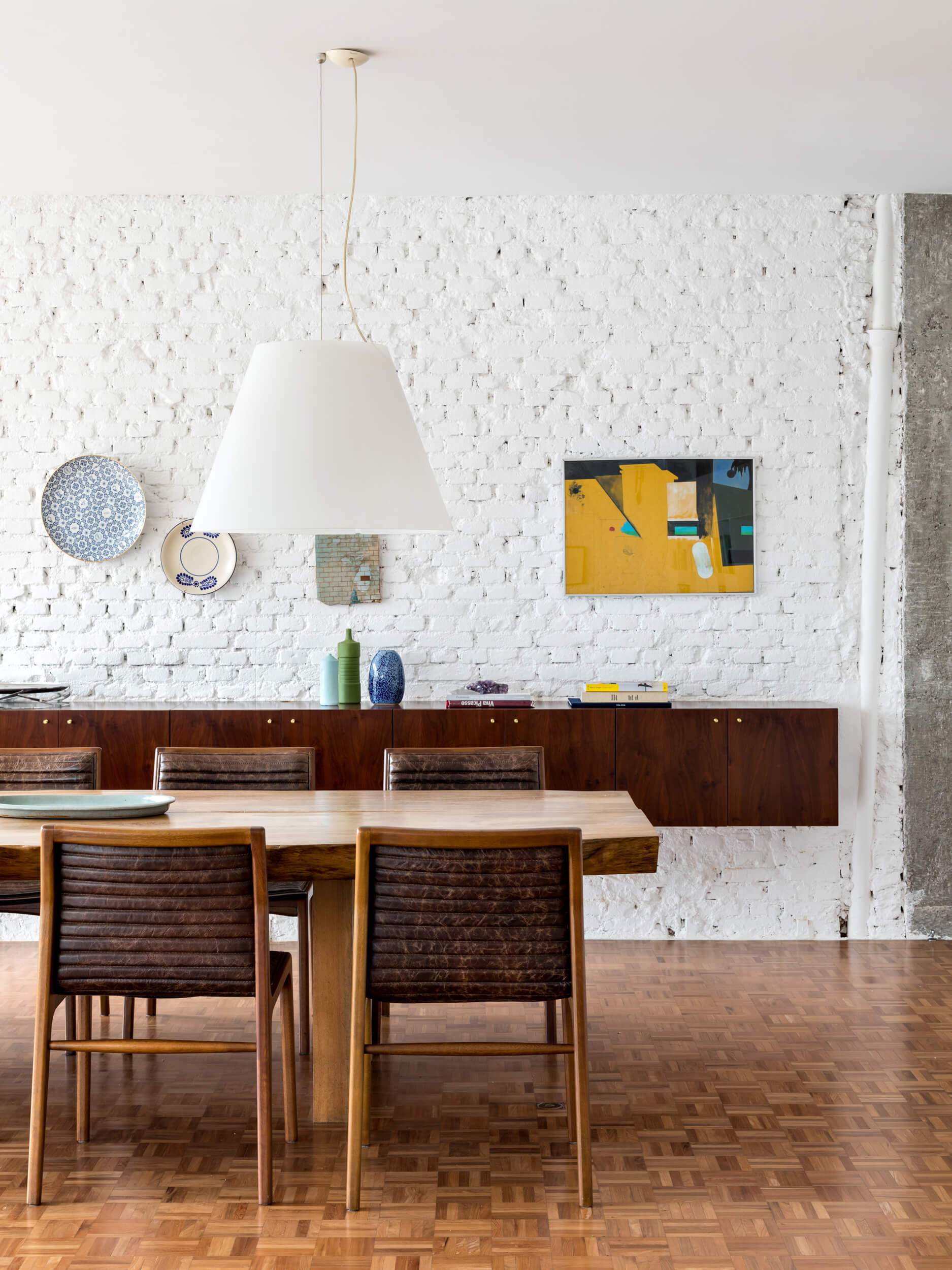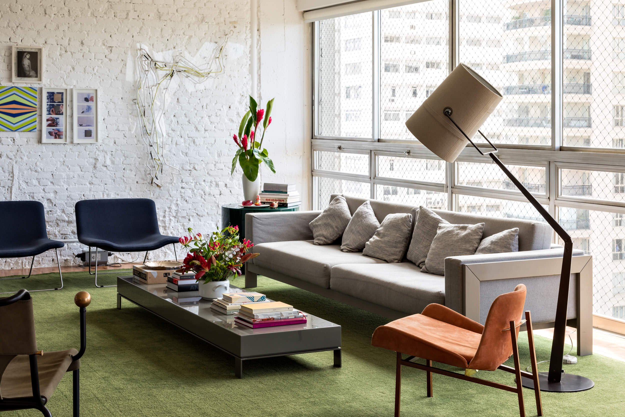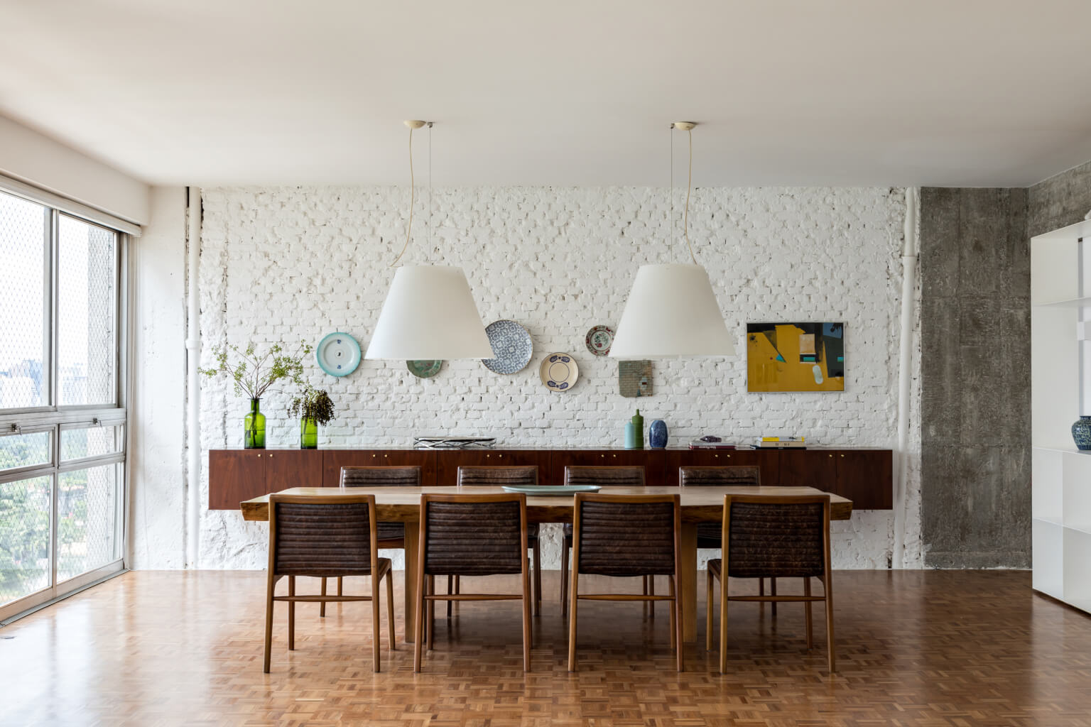 Para além de espaços generosos, outro aspecto importante para o espaçoso apartamento, é a abundante luz natural. Ela atravessa os caixilhos de piso a teto e banha a área social toda pintada de branco, em contraste com o piso de madeira original e o mobiliário em cores vivas. O branco em diferentes texturas, estante em chapa metálica e parede de tijolo aparente, compõe o ambiente de ponta a ponta, conectando dois espaços que compartilham da generosa vista do apartamento.