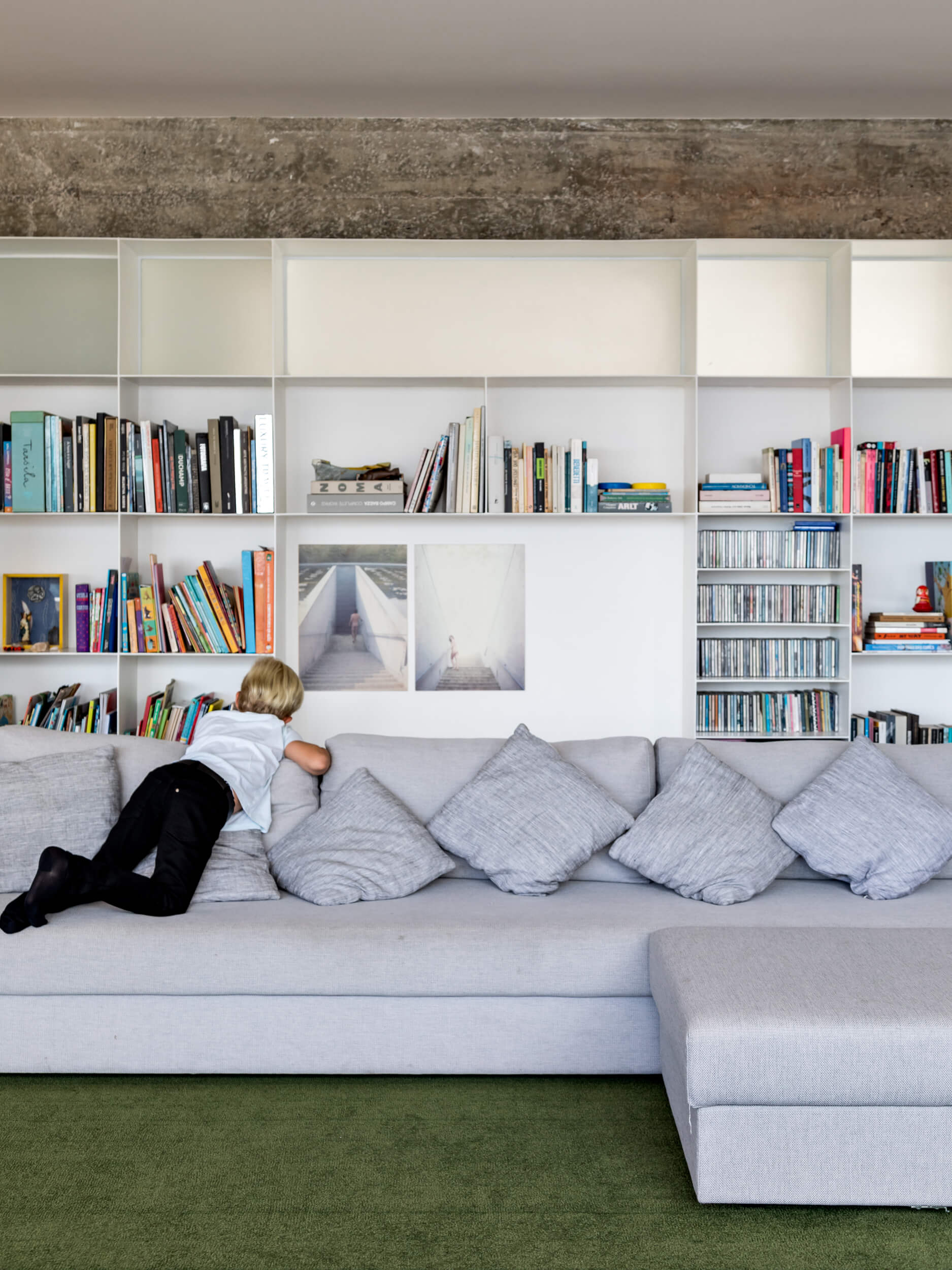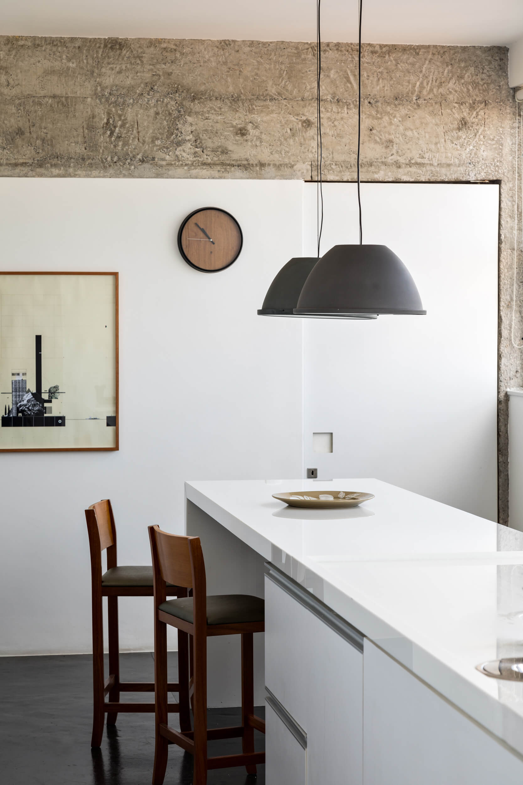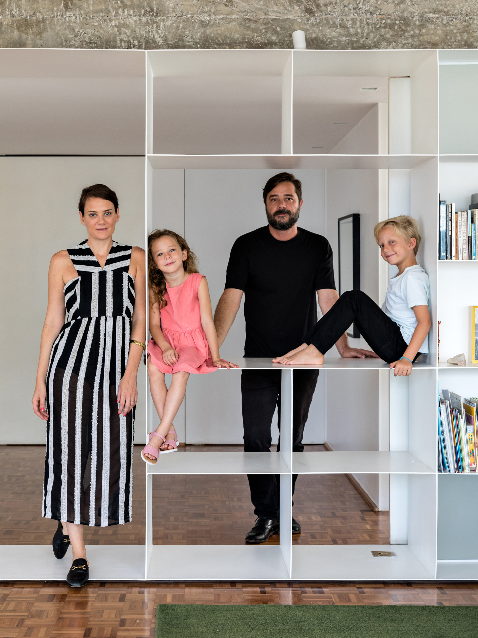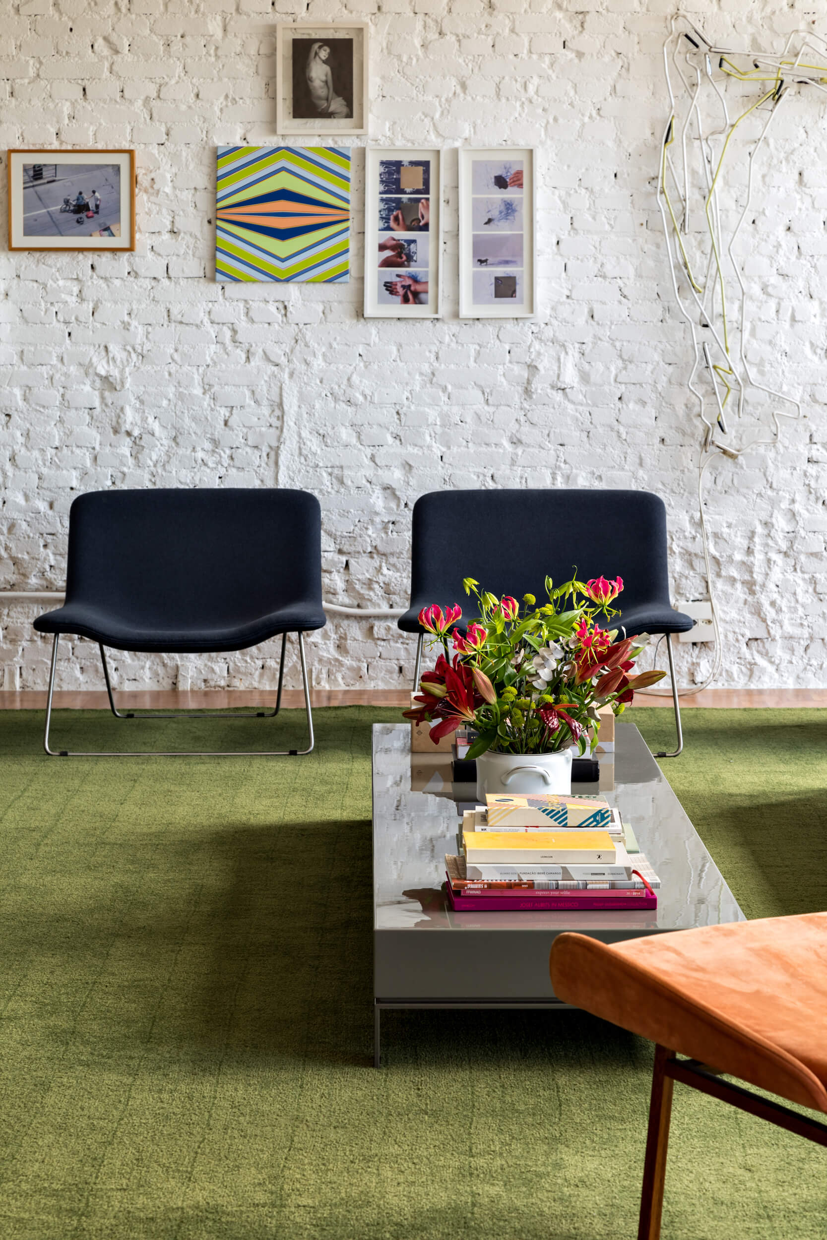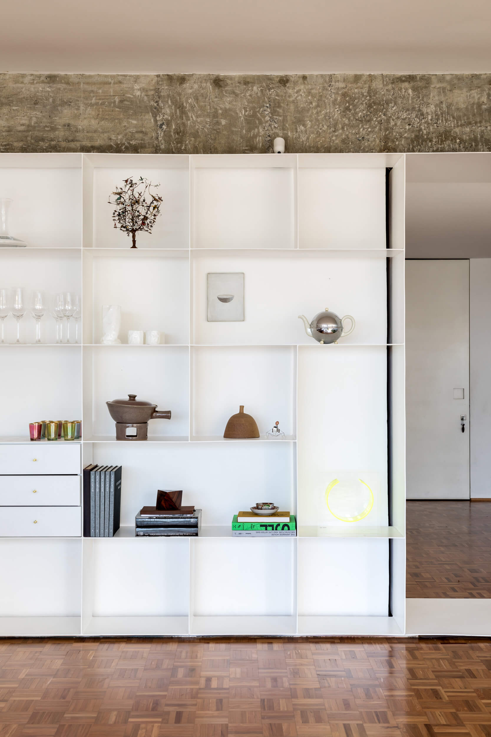 Para além de espaços generosos, outro aspecto importante para o espaçoso apartamento, é a abundante luz natural. Ela atravessa os caixilhos de piso a teto e banha a área social toda pintada de branco, em contraste com o piso de madeira original e o mobiliário em cores vivas. O branco em diferentes texturas, estante em chapa metálica e parede de tijolo aparente, compõe o ambiente de ponta a ponta, conectando dois espaços que compartilham da generosa vista do apartamento.