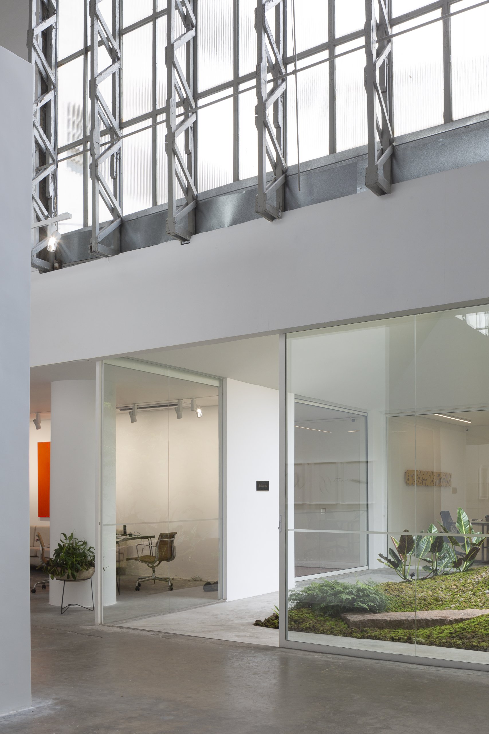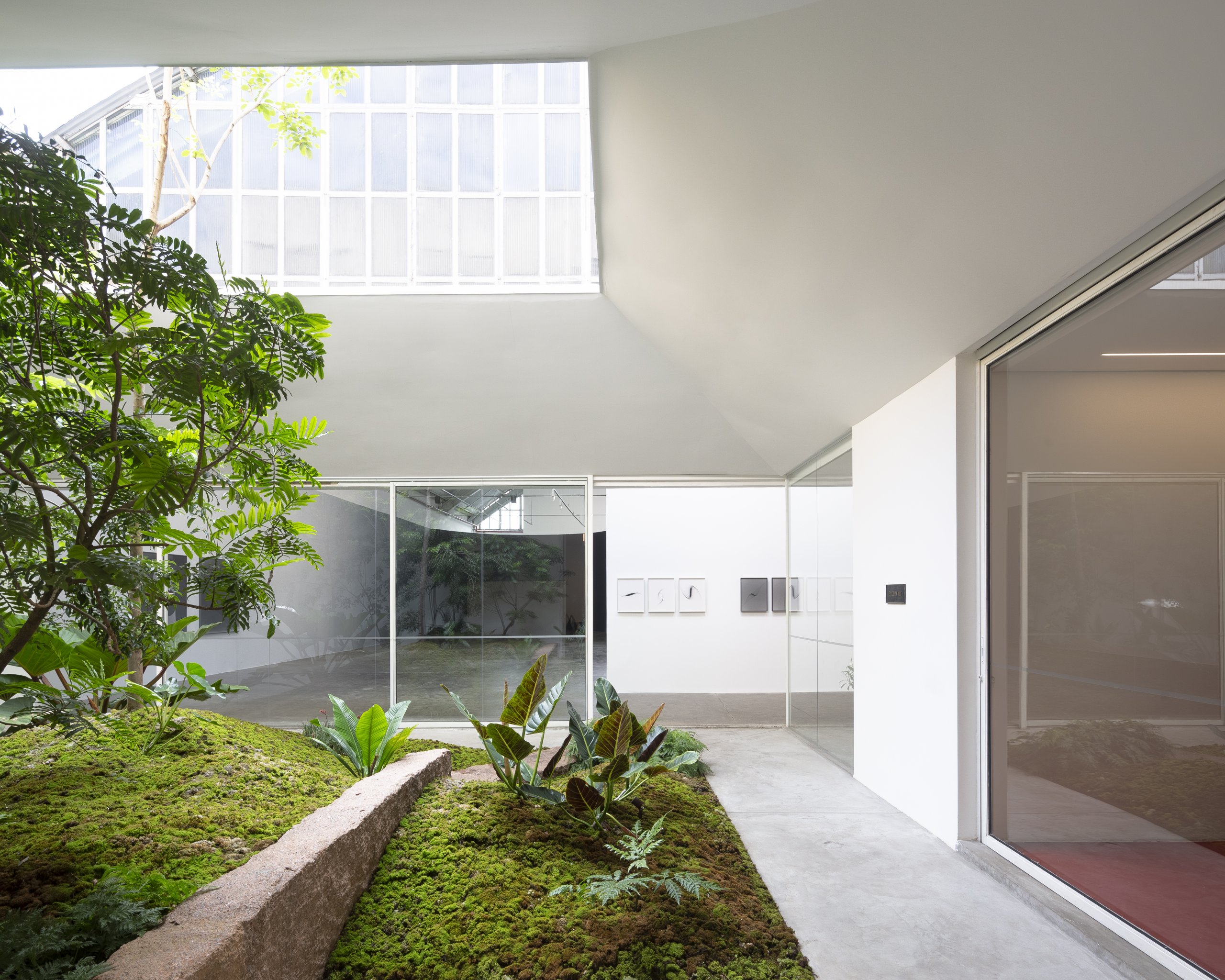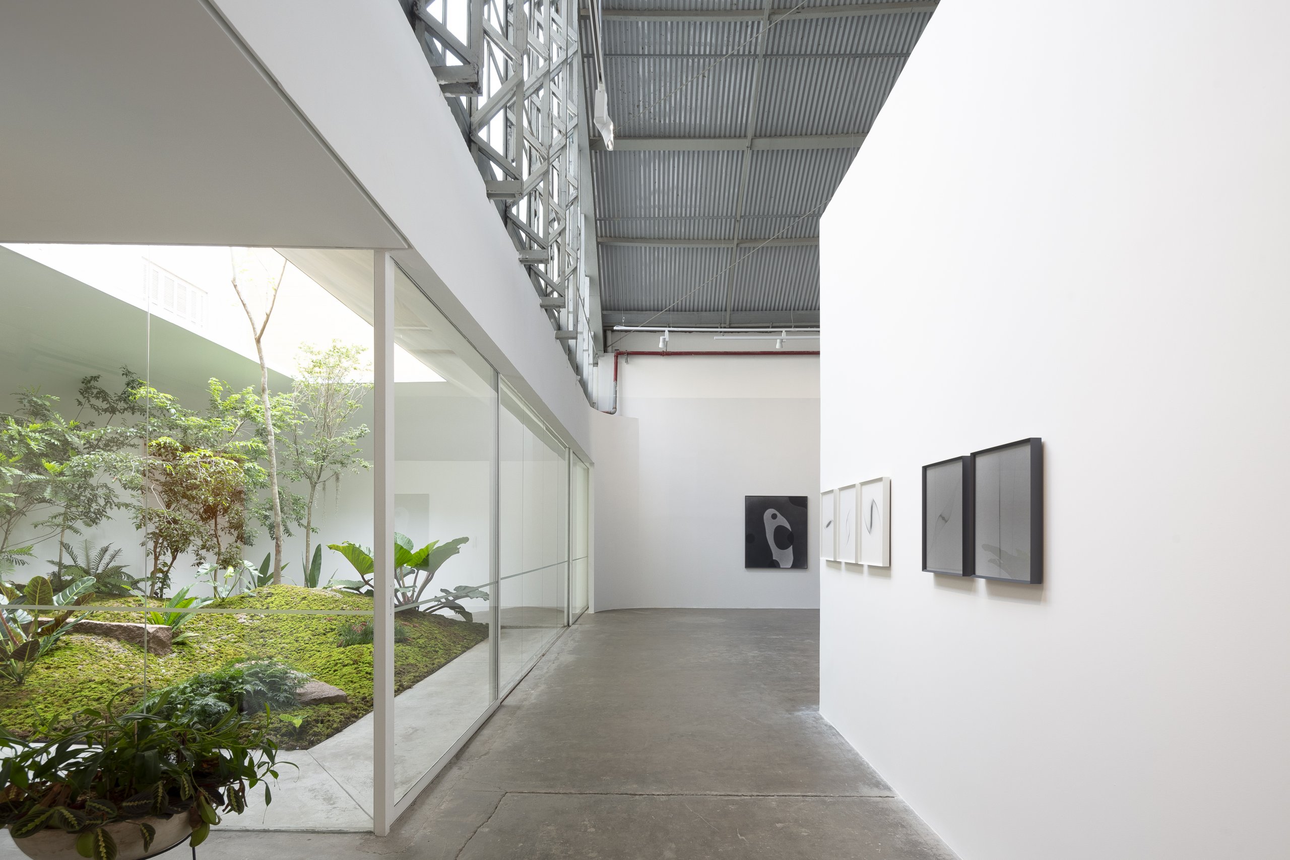 Por se tratar de um galpão industrial, o verde precisou ser criado. Um pátio interno foi esculpido, articulando os espaços servidores e o salão de exposição. A relação do verde do jardim com o entorno se dá de duas formas, formando uma paisagem emoldurada para o salão, cuja proporção permite distanciamento e enquadramento, e de continuidade para os ambientes internos, dando aos ambientes de menor pé direito maior intimidade.