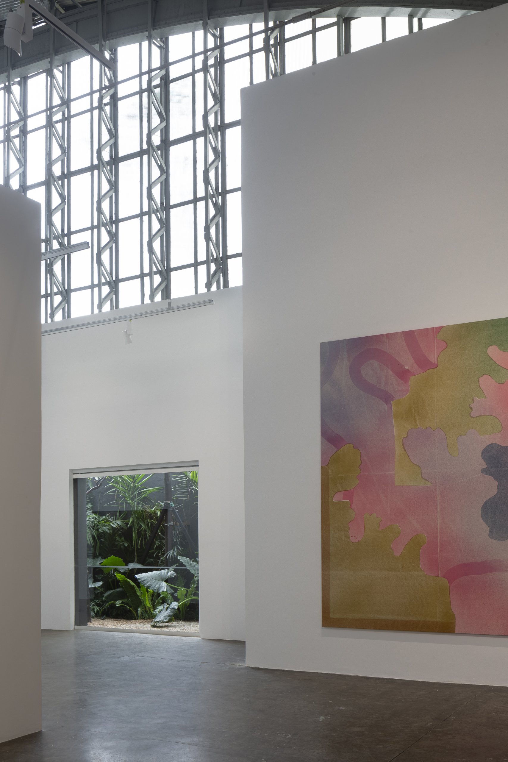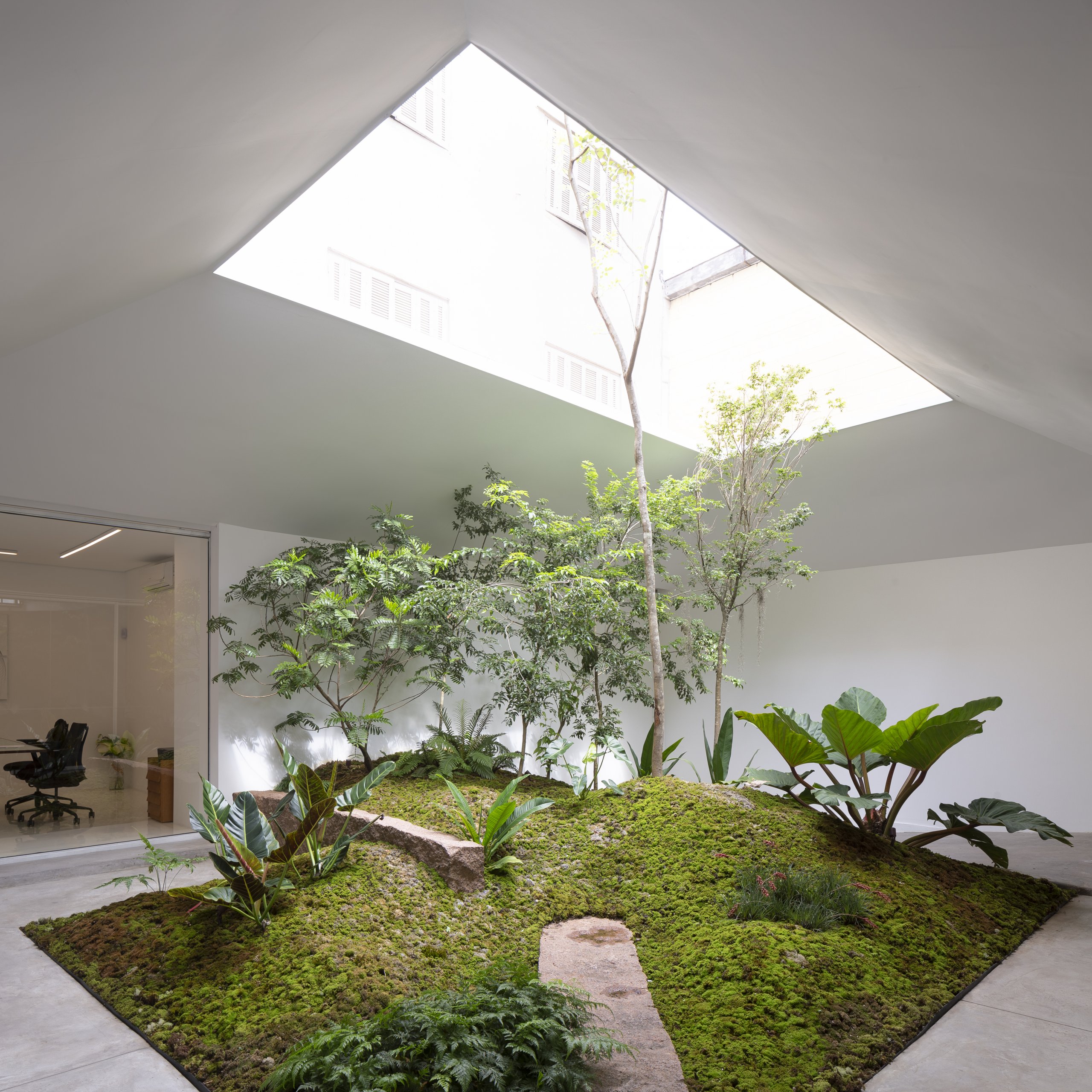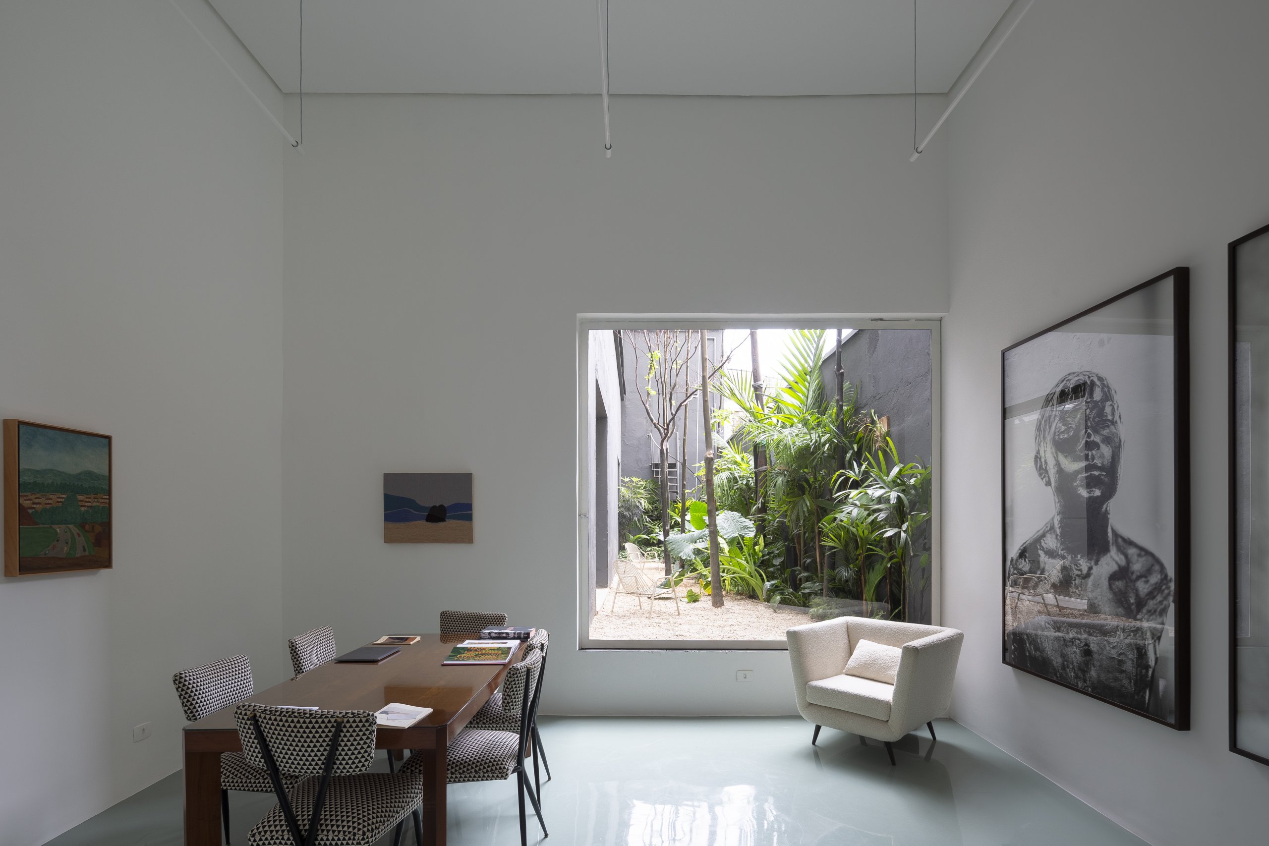 Por se tratar de um galpão industrial, o verde precisou ser criado. Um pátio interno foi esculpido, articulando os espaços servidores e o salão de exposição. A relação do verde do jardim com o entorno se dá de duas formas, formando uma paisagem emoldurada para o salão, cuja proporção permite distanciamento e enquadramento, e de continuidade para os ambientes internos, dando aos ambientes de menor pé direito maior intimidade.