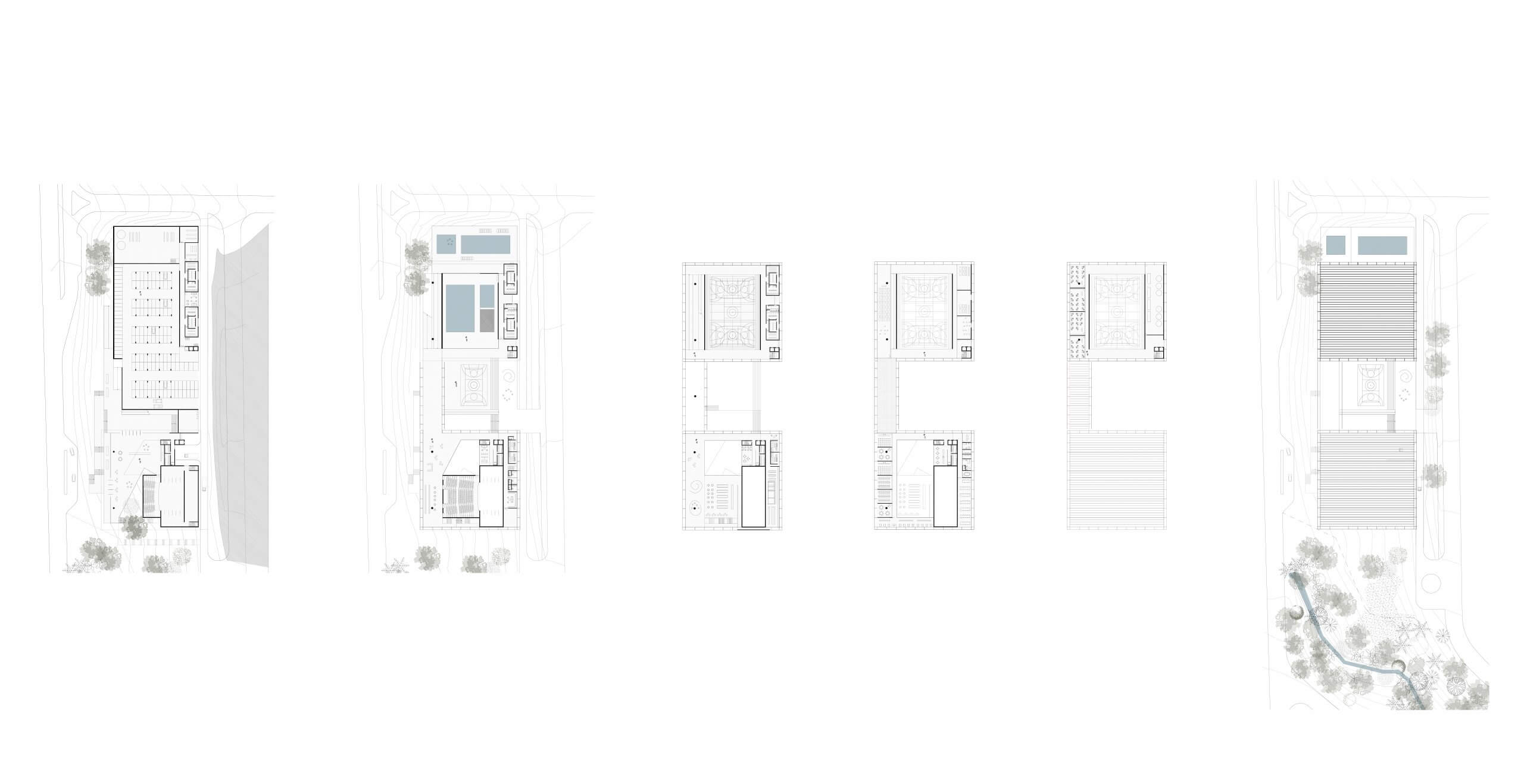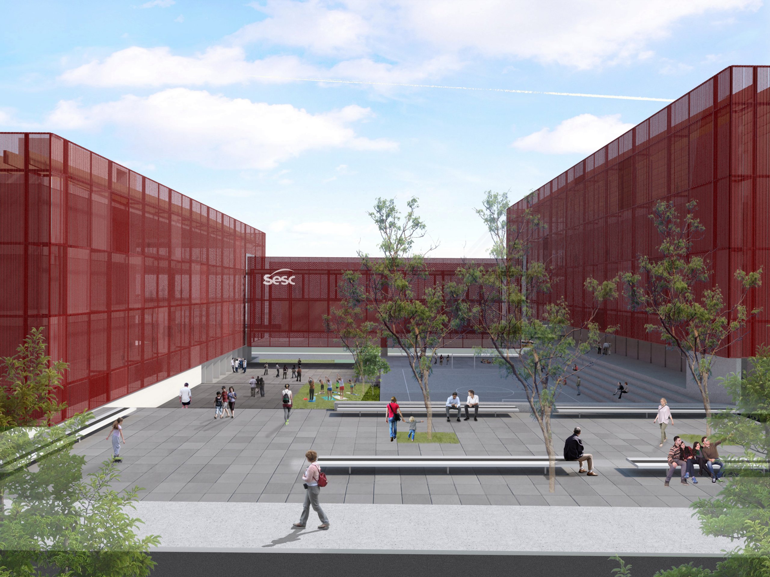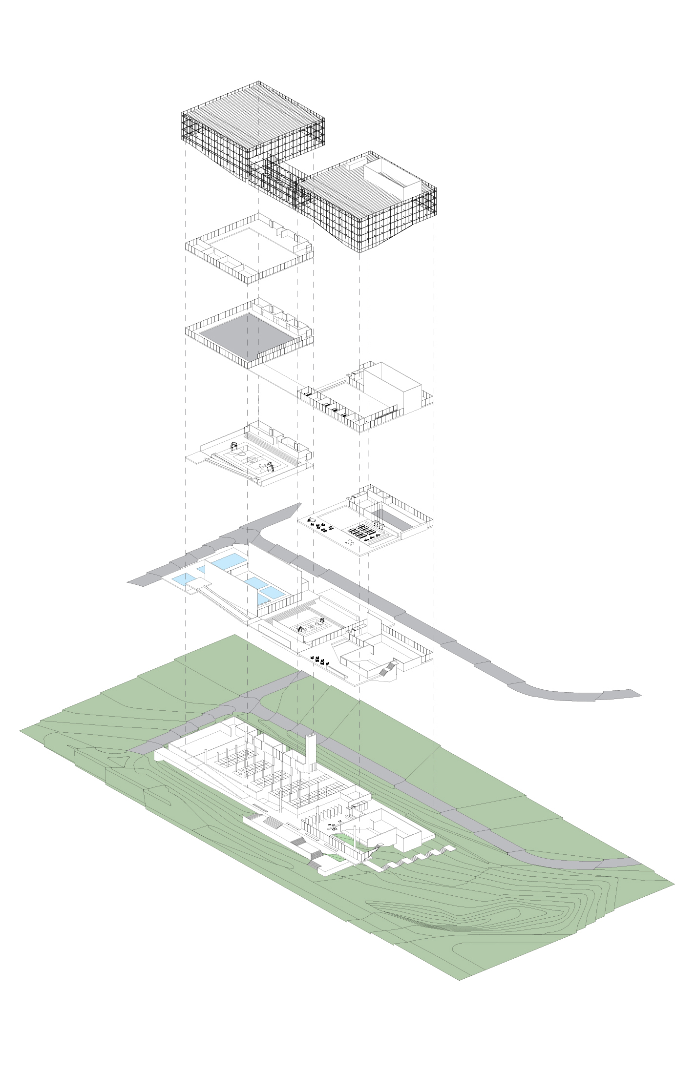 Um longo embasamento em dois pavimentos pousado no terreno redesenha o “chão”, realizando a transposição entre as vias existentes por meio dos generosos patamares que conformam a praça central articuladora do programa. Sobre o embasamento, de cada lado da praça, elevam-se dois blocos soltos e autônomos de planta quadrada de 50x50m, que contém respectivamente os programas esportivo/saúde – a norte – e cultural/administrativo, a sul.