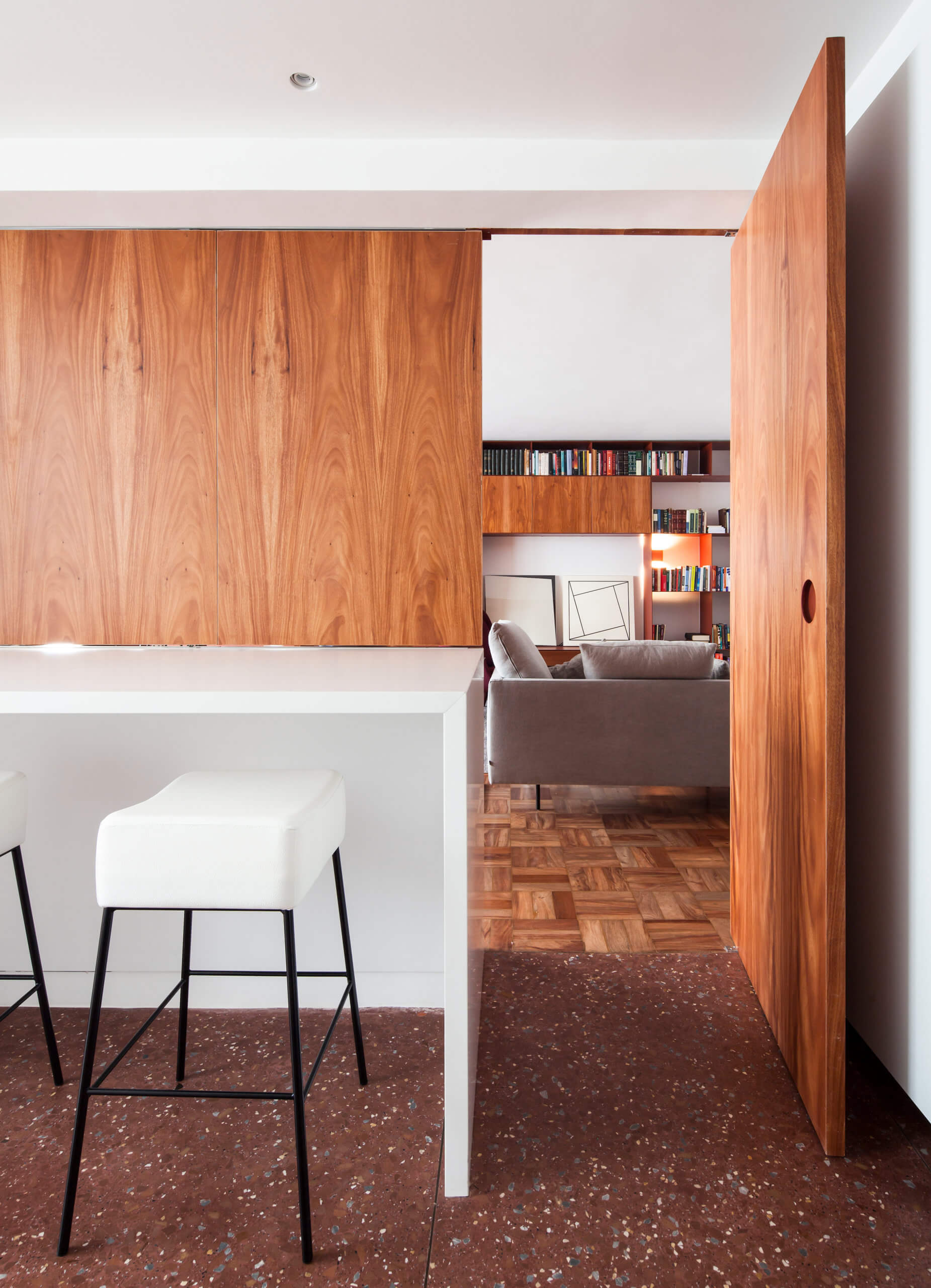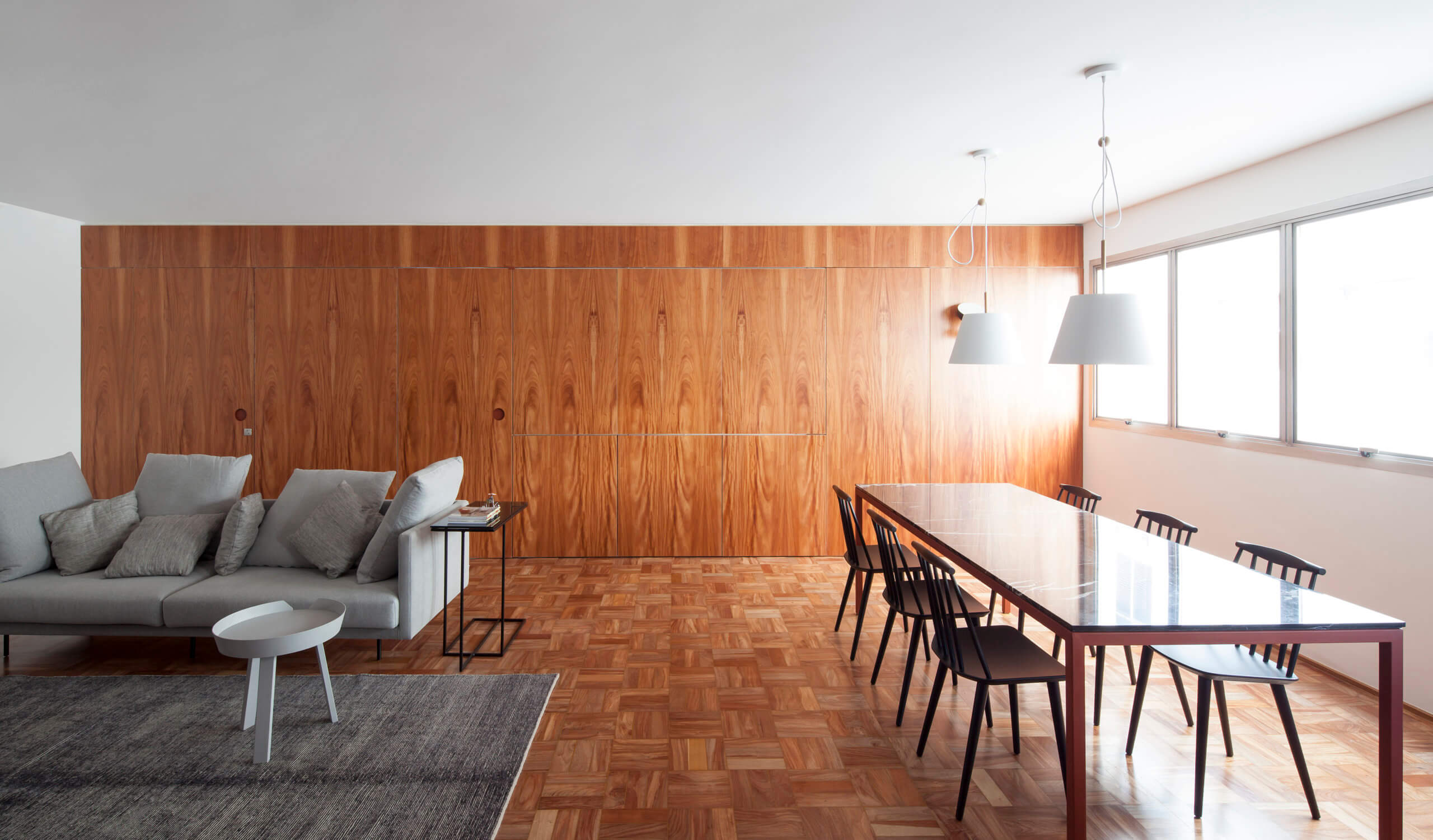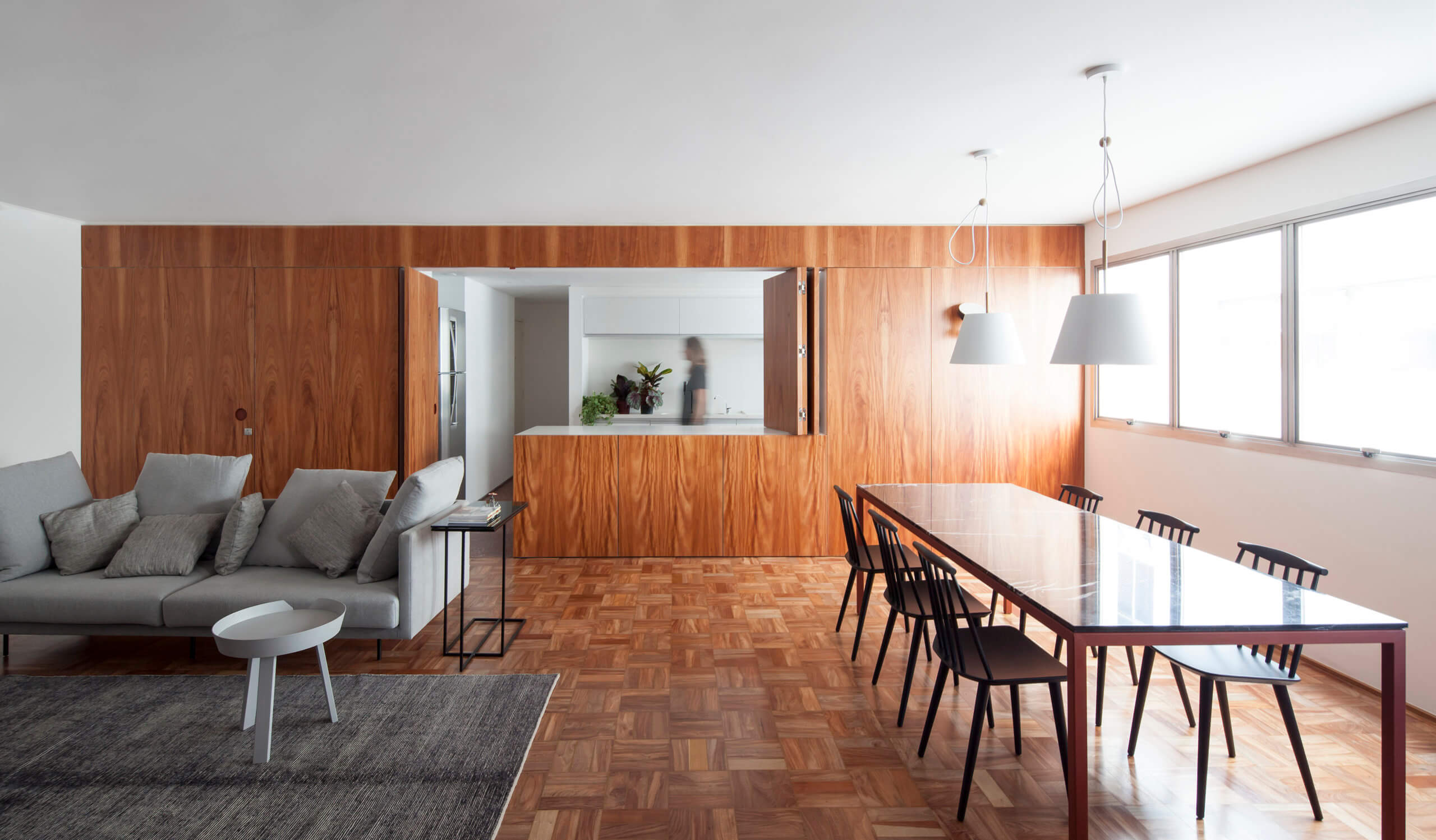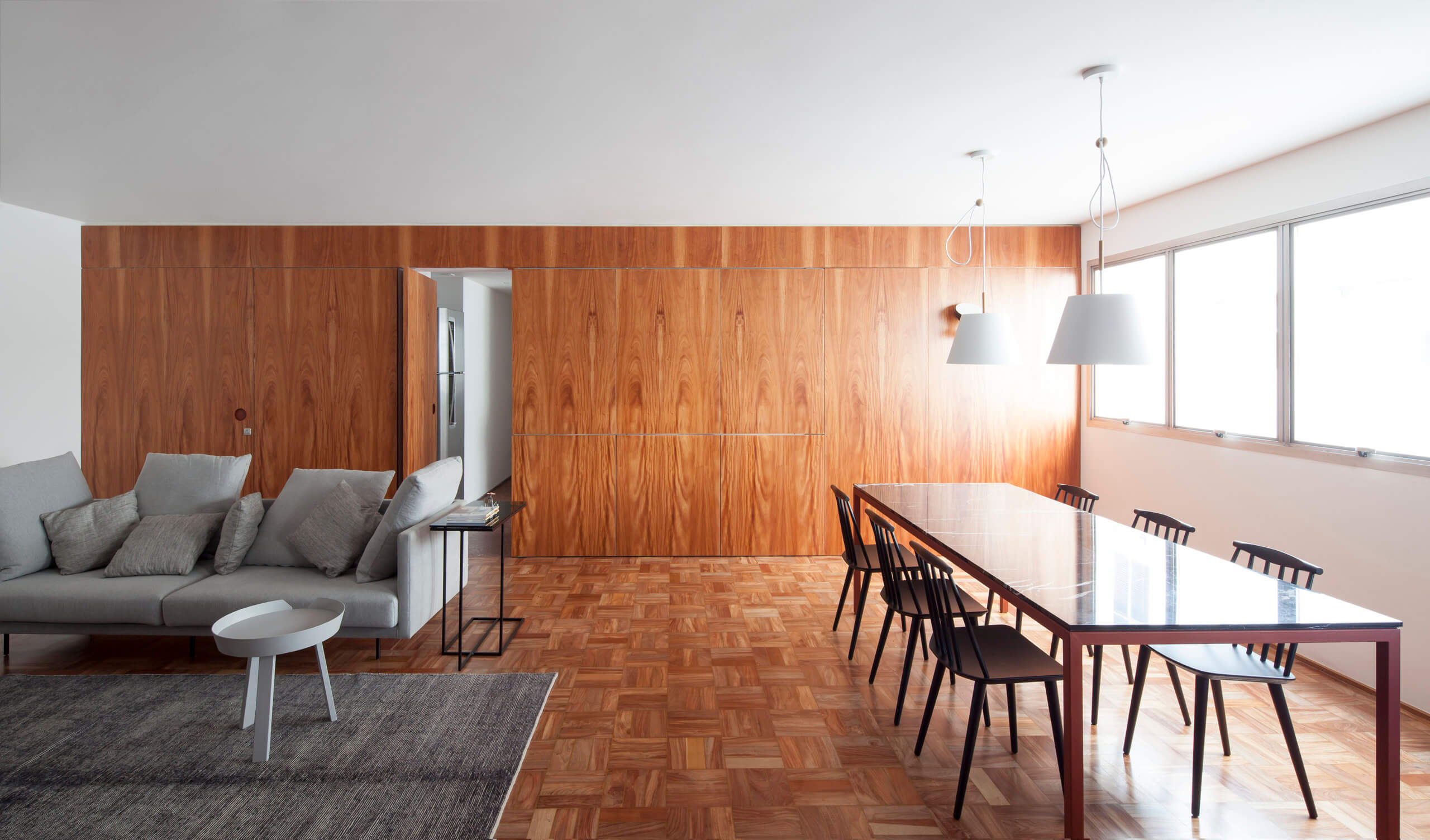 O projeto partiu da reorganização interna do apartamento para criar um escritório aberto que se comunica com toda área ao seu redor, gerando maior fluidez nos espaços da sala, cozinha e quartos.