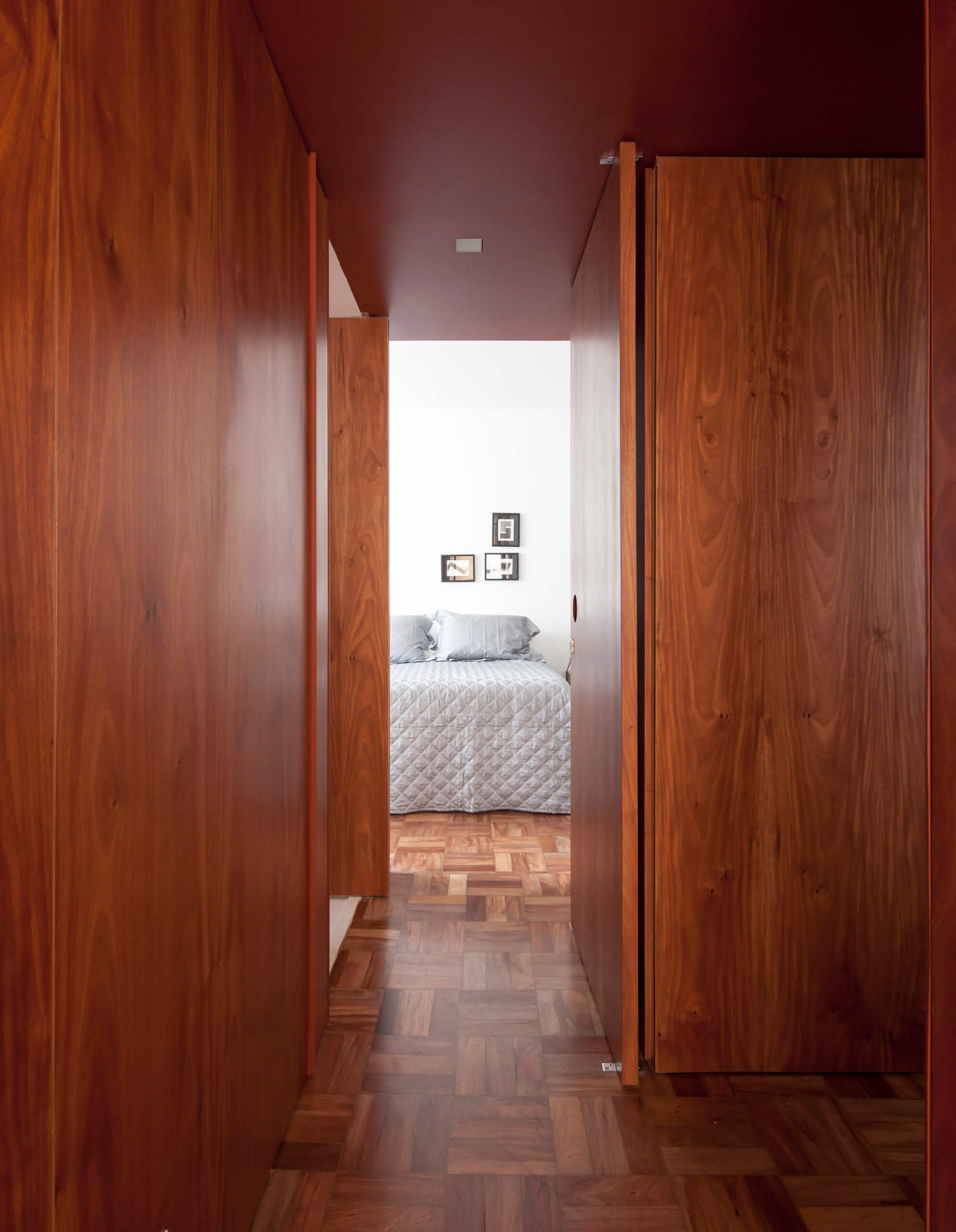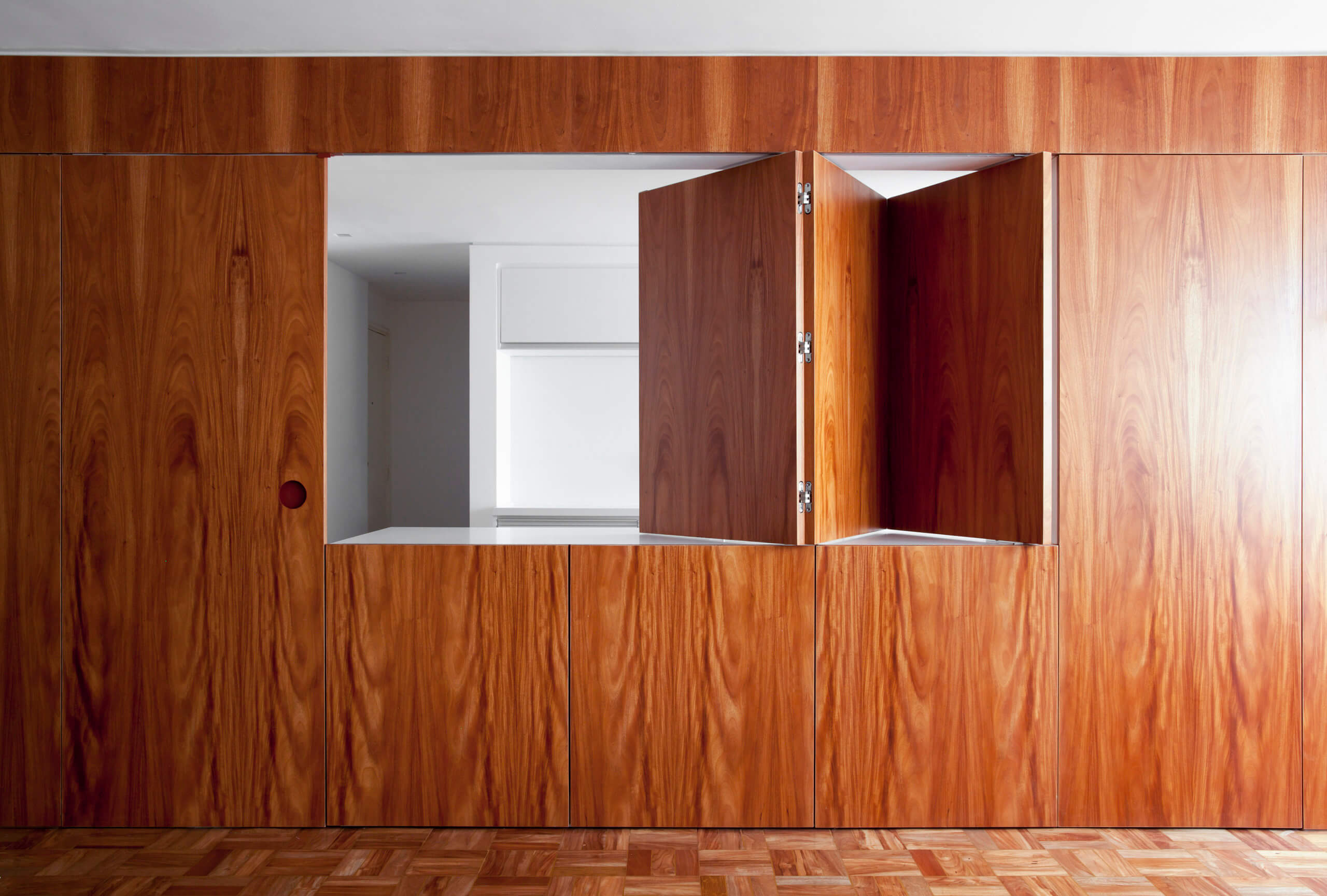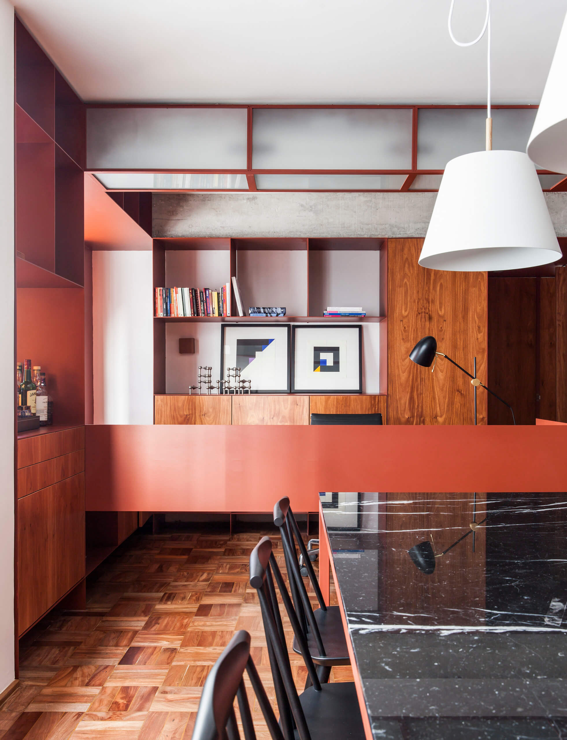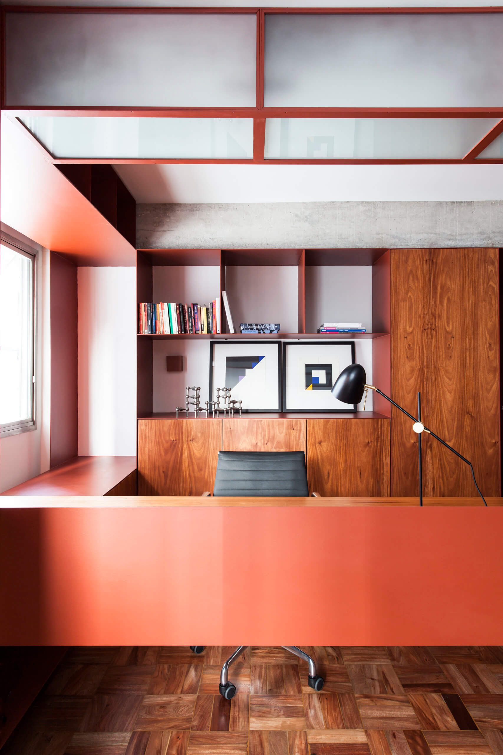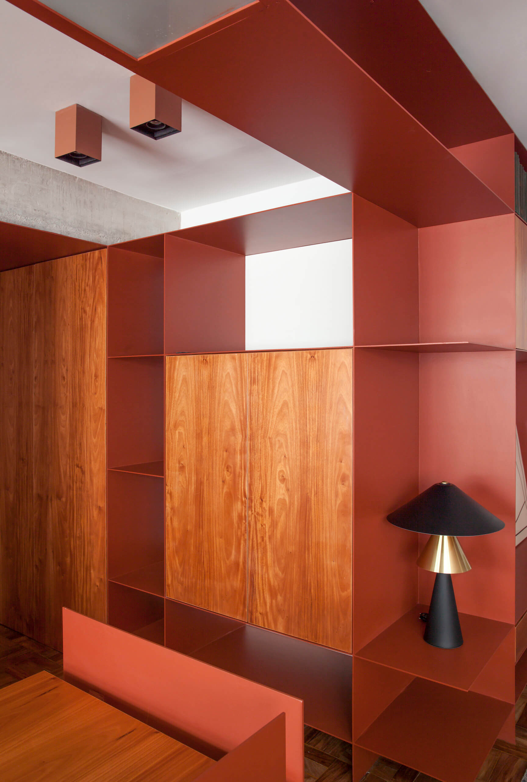 Foi construída uma estante metálica que pode ser vista como elemento central do apartamento. Feito em chapa metálica com diversos nichos esse elemento trabalha em três dimensões, configurando diferentes espaços: a mesma estante se transforma tanto em iluminação para a sala, quanto na própria mesa do escritório, além de apoio para o bar e acabamento do corredor que leva aos dormitórios